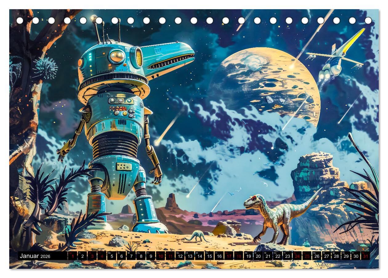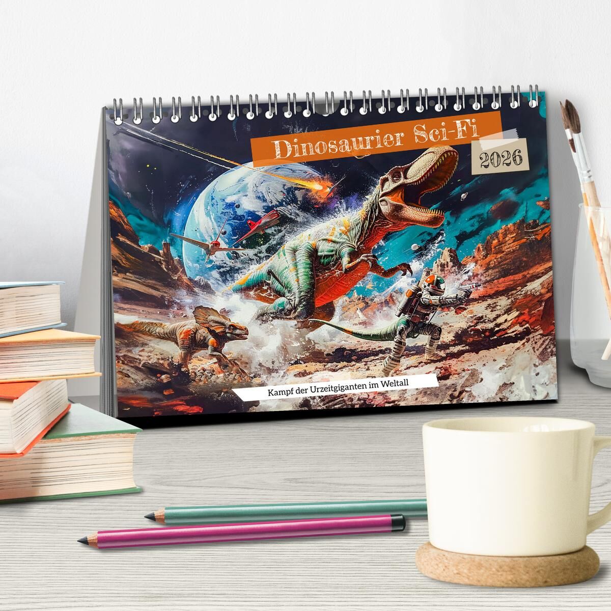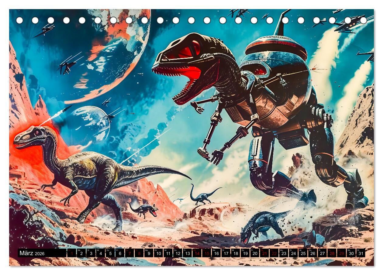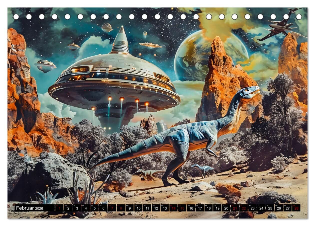 Dinosaurier Sci-Fi - Kampf der Urzeitgiganten im Weltall (Tischkalender 2026 DIN A5 quer), CALVENDO Monatskalender