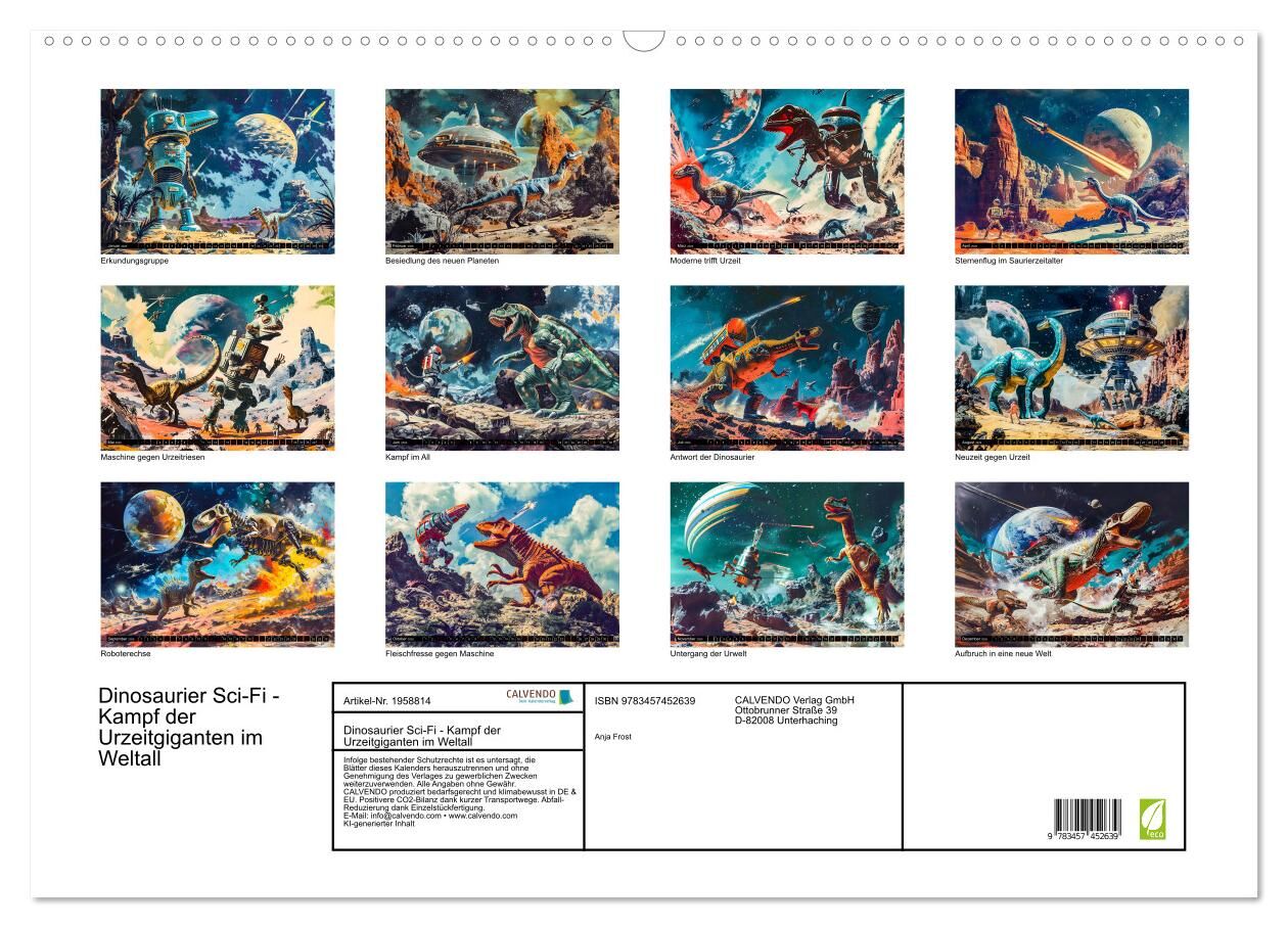 Entdecken Sie mit unserem Kalender "Dinosaurier Sci-Fi - Kampf der Urzeitgiganten im Weltall" eine epische Saga aus einer fernen Vergangenheit. Tauchen Sie ein in eine Welt voller Science-Fiction und Fantasy, in der die majestätischen Dinosaurier gegen furchte...