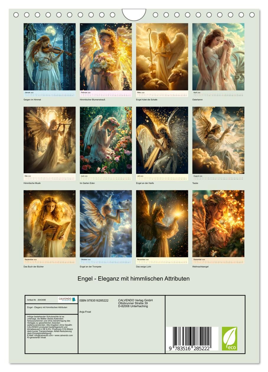 Tauchen Sie ein in die göttliche Welt der Engel mit unserem exquisiten Kalender 'Engel - Eleganz mit himmlischen Attributen'. Jeder Monat präsentiert himmlische Wesen, umgeben von Symbolen wie Schafen, Tauben und himmlischer Musik. Die kunstvollen, KI-generier...