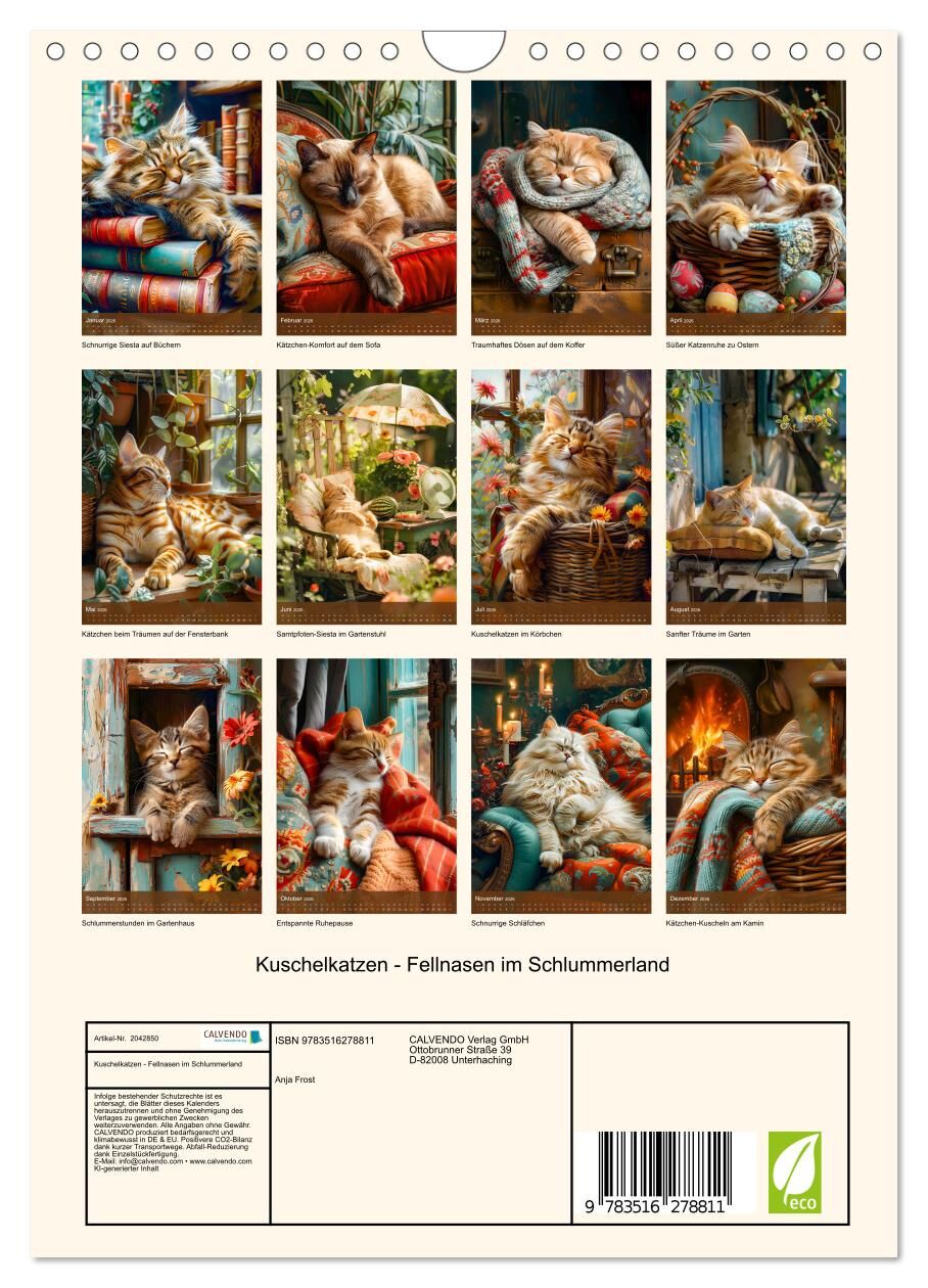 Entdecken Sie mit unserem Kalender "Kuschelkatzen - Fellnasen im Schlummerland" die zauberhafte Welt der Katzenruhe. Begleiten Sie unsere pelzigen Freunde durch den Garten, das Haus und andere gemütliche Plätze, während sie in den unmöglichsten Positionen schl...