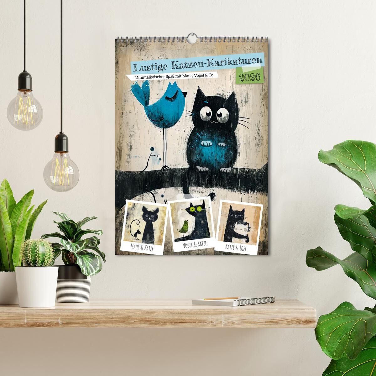 Lustige Katzen-Karikaturen - Minimalistischer Spaß mit Maus, Vogel und Co (Wandkalender 2026 DIN A3 hoch), CALVENDO Monatskalender