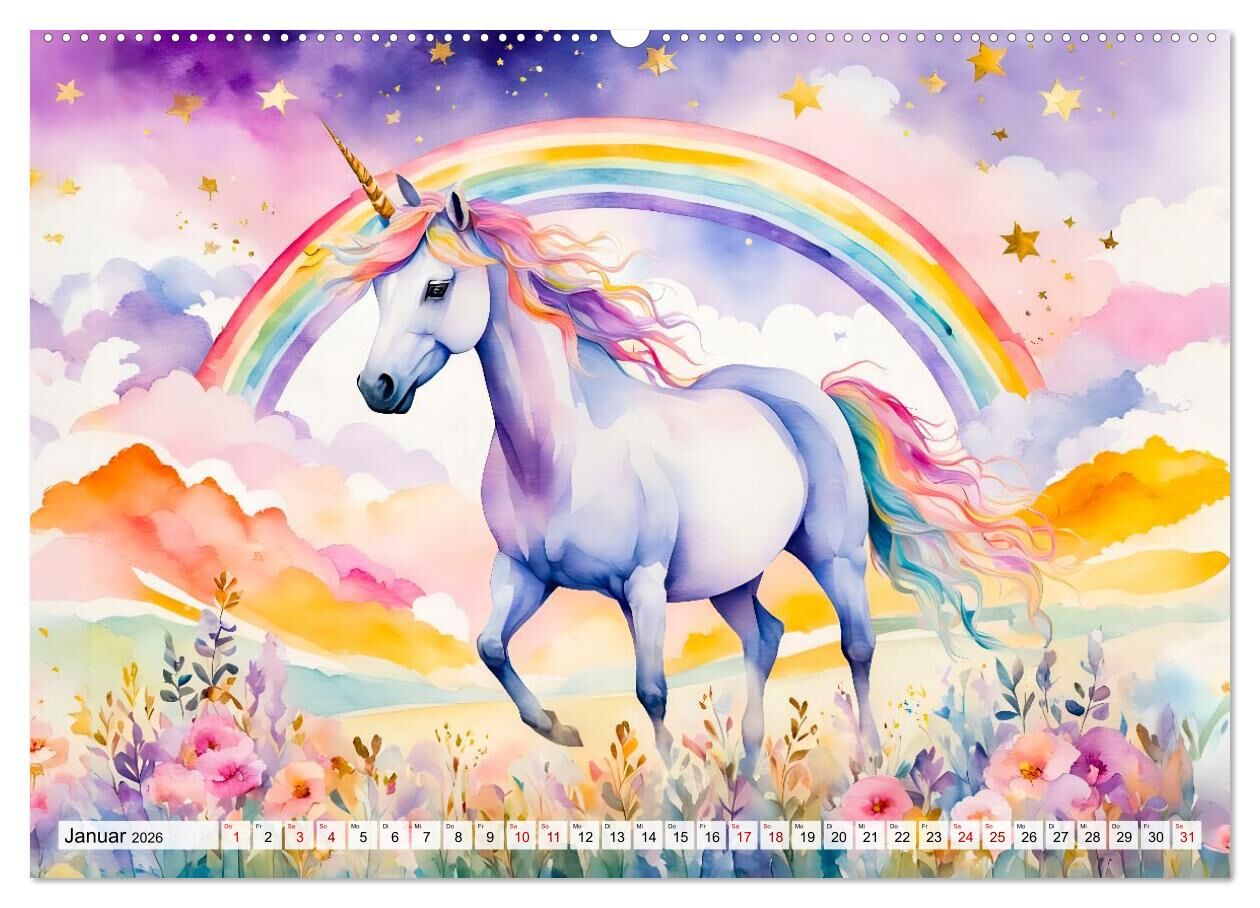 Magische Einhörner - Traumlandschaften unterm Regenbogen (Wandkalender 2026 DIN A2 quer), CALVENDO Monatskalender