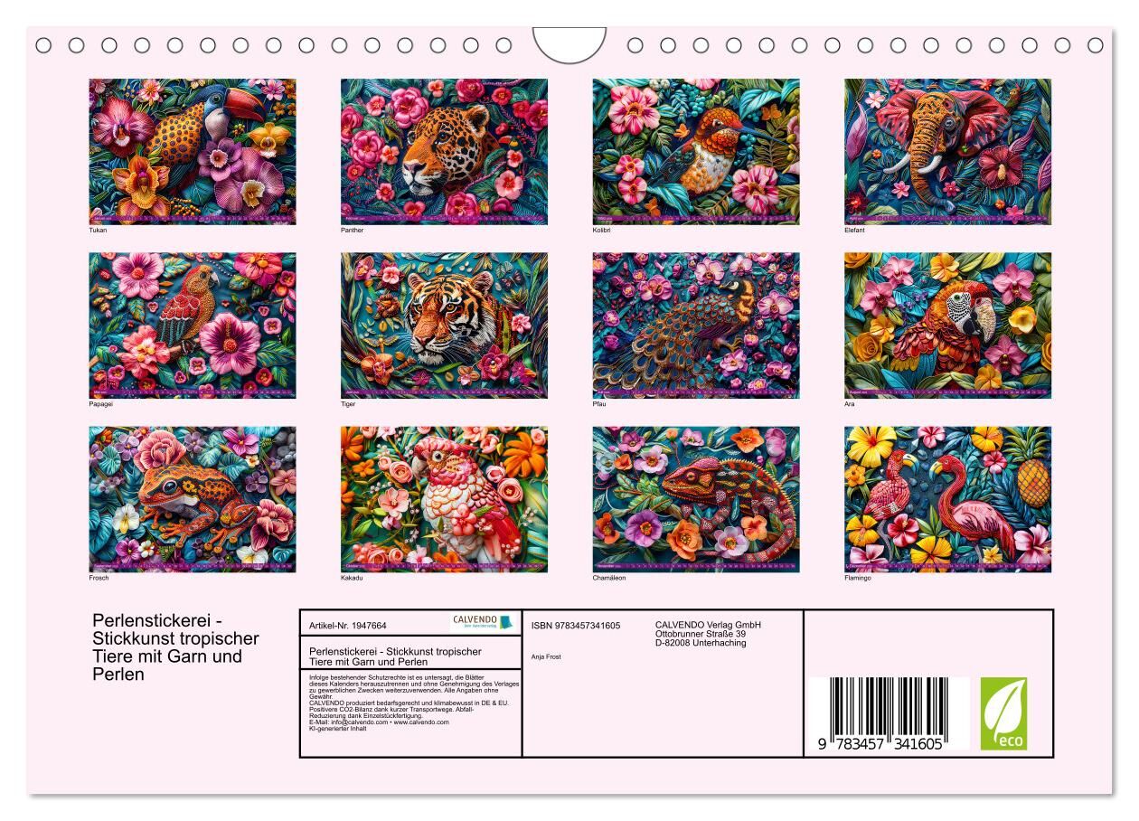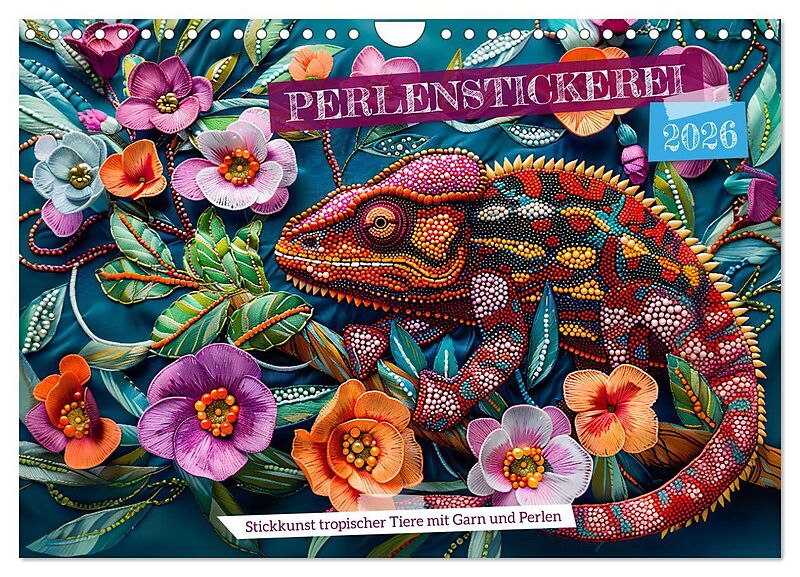 Entdecken Sie die faszinierende Welt der Perlenstickerei mit unserem Kalender "Perlenstickerei - Stickkunst tropischer Tiere mit Garn und Perlen". Jedes Motiv zeigt kunstvoll gestaltete KI-generierte Tierporträts, die digital mit glänzenden Perlen und feinem G...