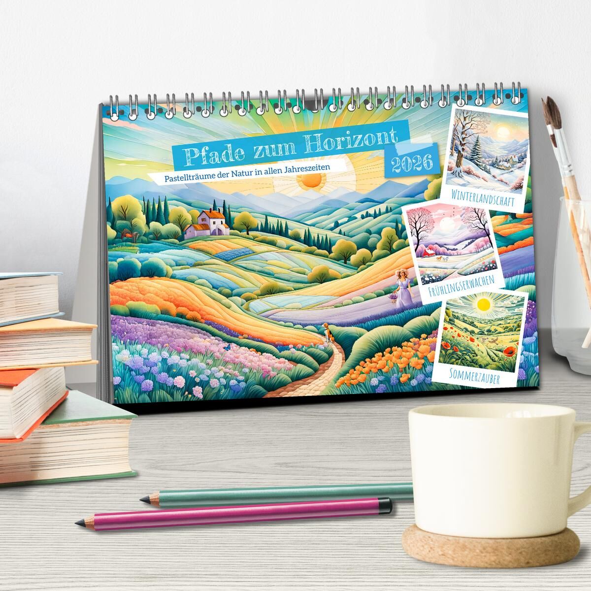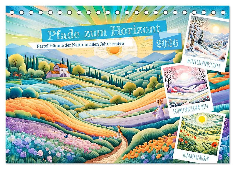 Erleben Sie die Schönheit der Natur in sanften Pastelltönen. Der Kalender "Pfade zum Horizont Pastellträume der Natur in allen Jahreszeiten" entführt Sie auf eine Reise durch blühende Wiesen, goldene Felder und farbenfrohe Blumenlandschaften. Jede KI-generiert...