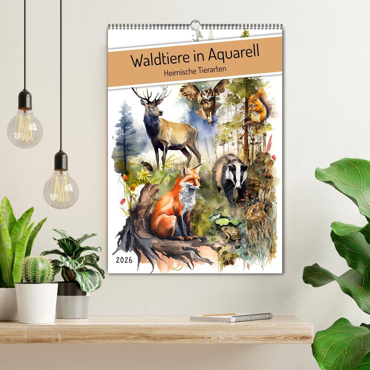 Waldtiere in Aquarell - Heimische Tierarten (Wandkalender 2026 DIN A2 hoch), CALVENDO Monatskalender