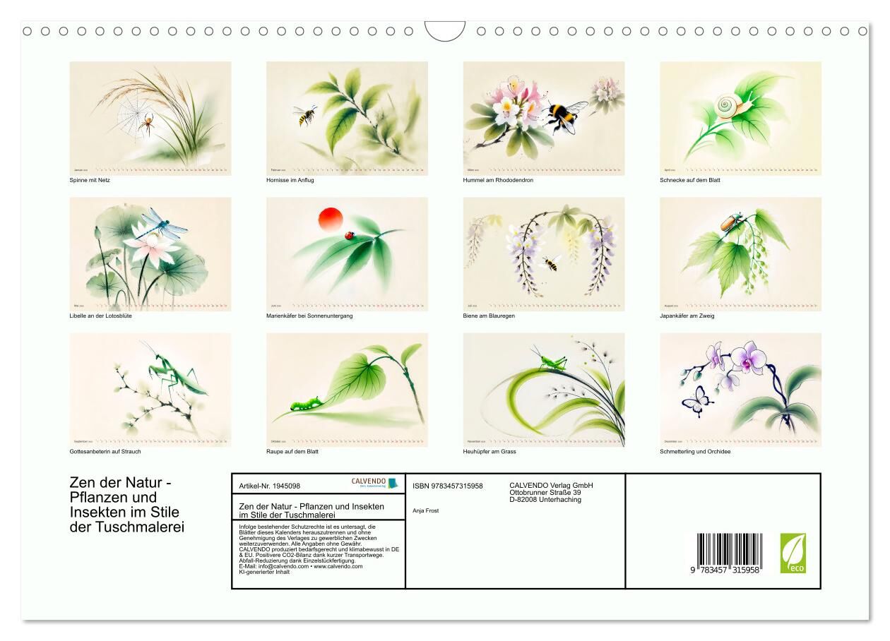 Tauchen Sie ein in die faszinierende Welt der Natur mit unserem Kalender "Zen der Natur". Jede Seite dieses einzigartigen Kalenders zeigt atemberaubende KI-generierten Illustrationen von Pflanzen und Insekten, meisterhaft im traditionellen Stil der Tuschmalere...