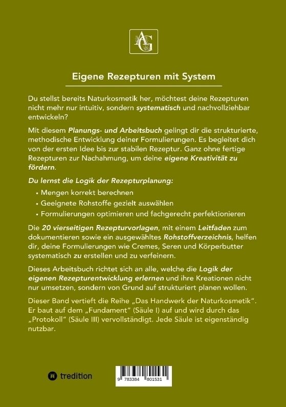 Was dich in diesem Buch erwartet"Naturkosmetik - Die Rezeptur-Logik Säule II" begleitet dich beim Übergang vom bloßen Nachrühren fremder Rezepte hin zur eigenständigen Planung deiner individuellen Pflegeprodukte. In diesem Praxisbuch stehen deine Ent...