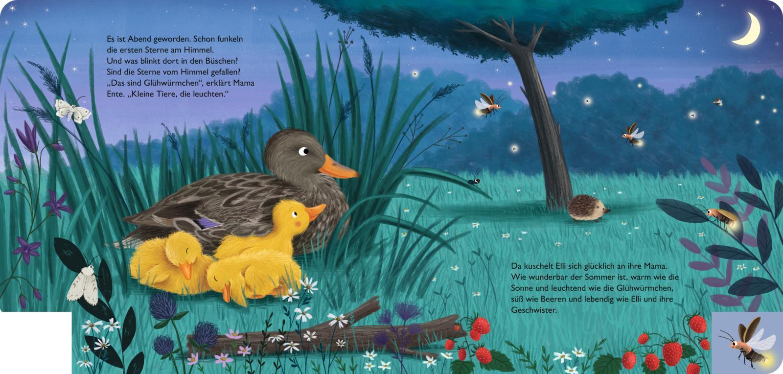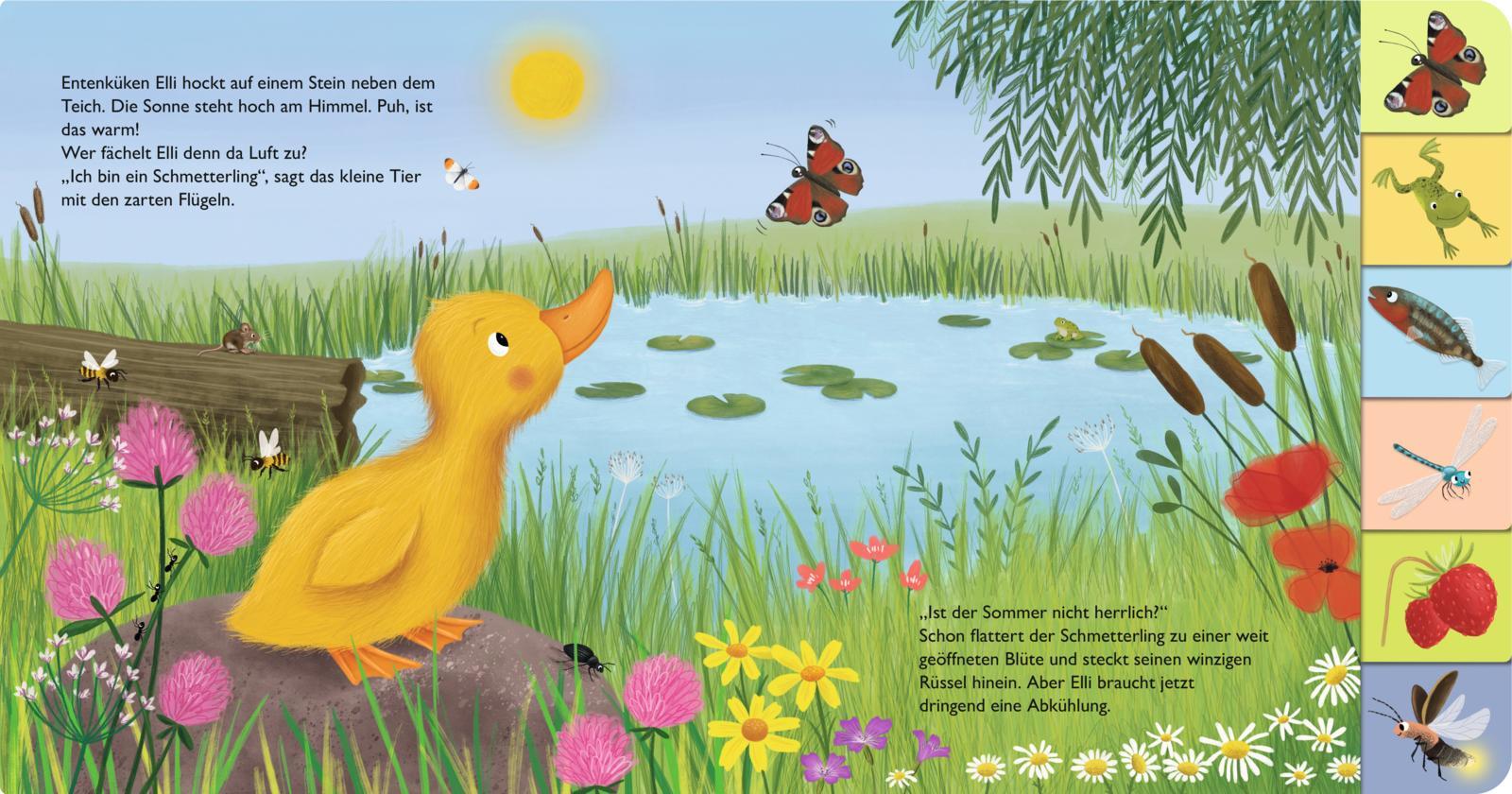 Der Sommer ist da! Ein wundervolles Mitmachbuch für die Allerkleinsten. Die kleine Ente Elli entdeckt jeden Tag etwas Neues: den bunten Schmetterling, die Fische im Wasser oder die Erdbeeren, von denen Elli nicht genug kriegen kann. Gemeinsam mit dem niedlich...