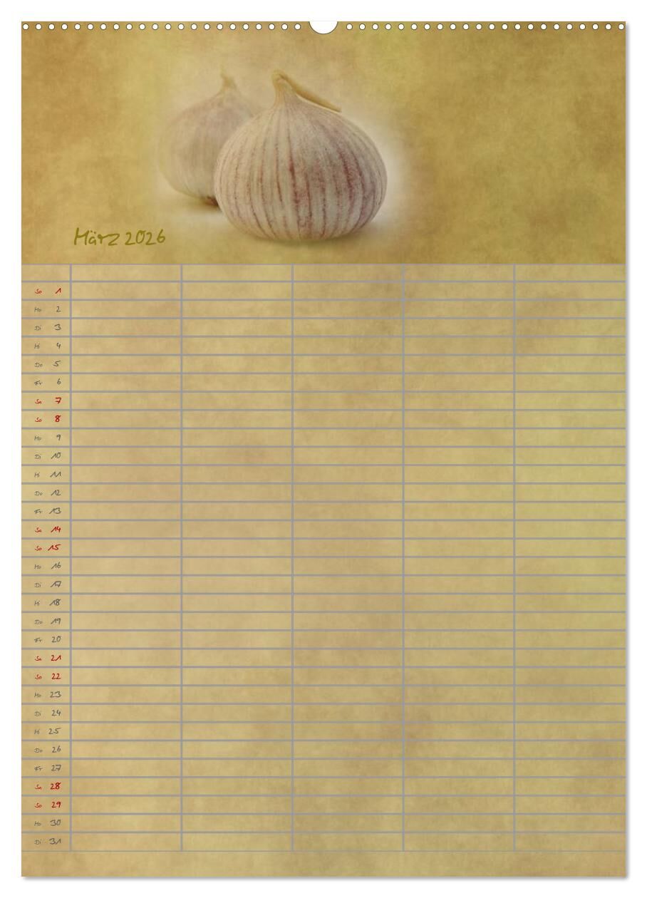 Ein praktischer Familienplaner für die Küche mit stilvollen Fotos von Obst, Gemüse, Kräutern und mehr.