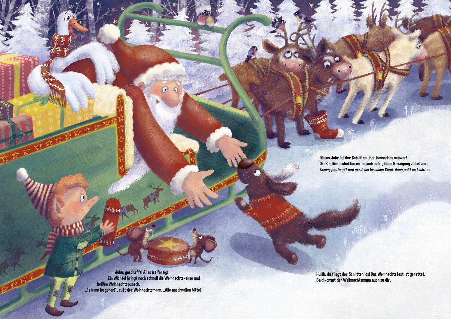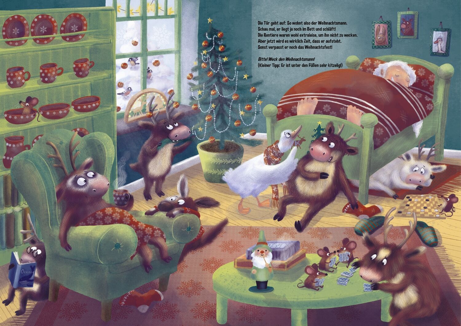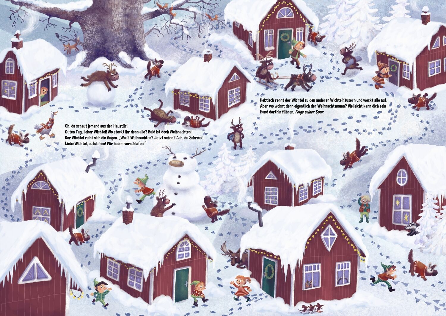 Wo ist der Weihnachtsmann? Im Weihnachtsdorf ist es winterlich still. Viel zu still! Hat der Weihnachtsmann etwa verschlafen? Oh weh! Jetzt gibt es viel zu tun. Dass ist nur zu schaffen, wenn alle mithelfen. Kinder und Vorlesende! Sucht gemeinsam das Haus des...