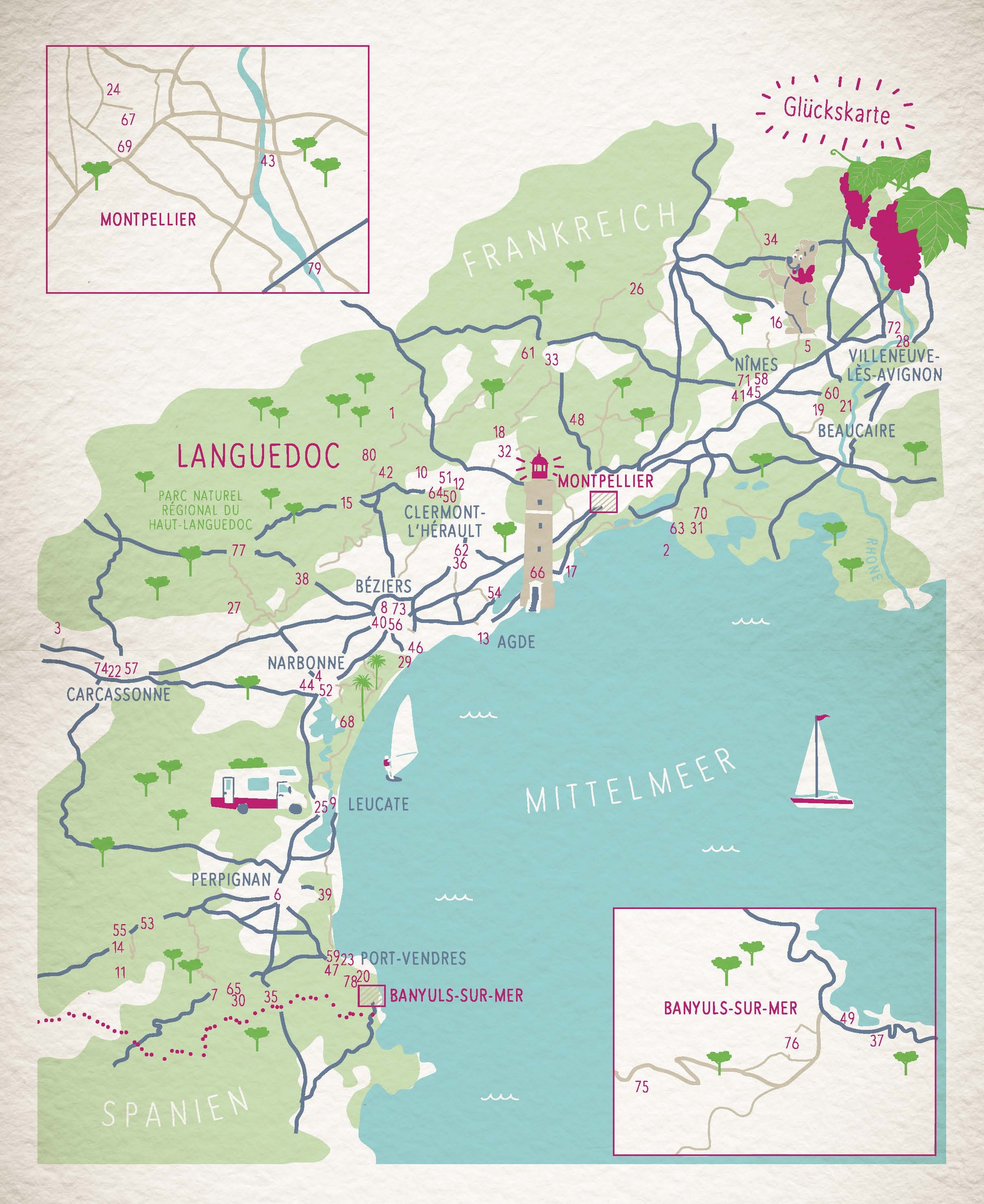 Schon die Römer fühlten sich an der südfranzösischen Mittelmeerküste wohl und bauten zahlreiche Kolonien. Ist ja auch kein Wunder: Vorne Meer, hinten Berge und dazwischen gedeihen die süßesten Trauben. Ob in Wanderstiefeln oder Badehose, mit Stadtplan oder Fer...