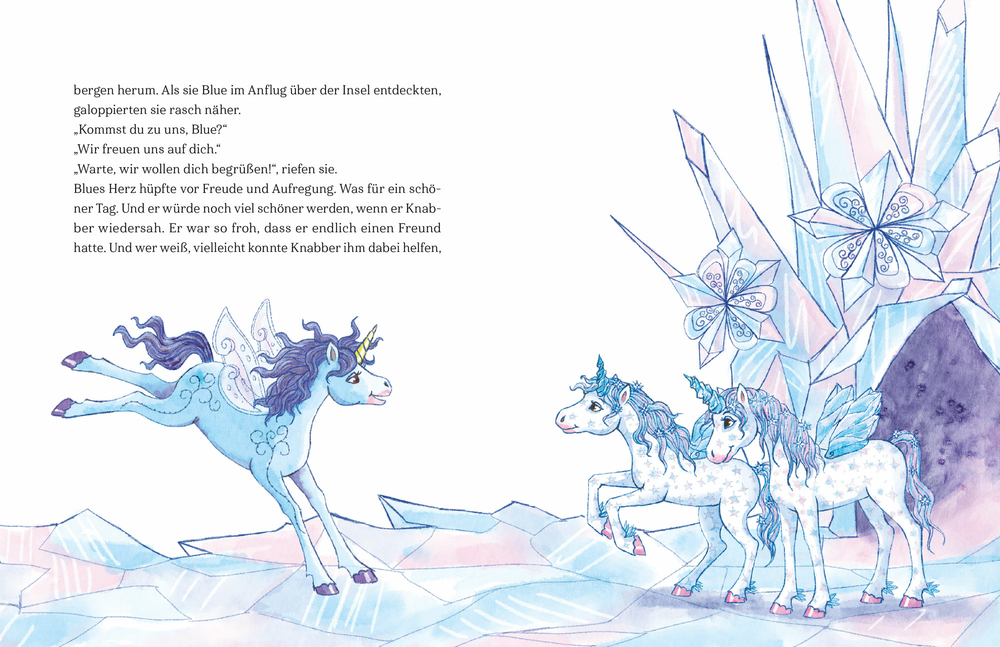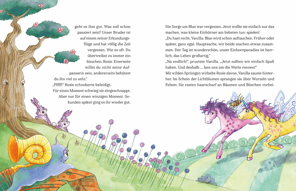Hinter dem Horizont, am Ende des Regenbogens liegt es: das Einhorn-Paradies. Dort ist jeder Tag ein zauberhaftes Abenteuer. Im Traumriff werden Wünsche wahr, auf dem Drachenfels tummeln sich wilde Funkeldrachen und der See auf der Mondseeinsel sagt die Zukunft...