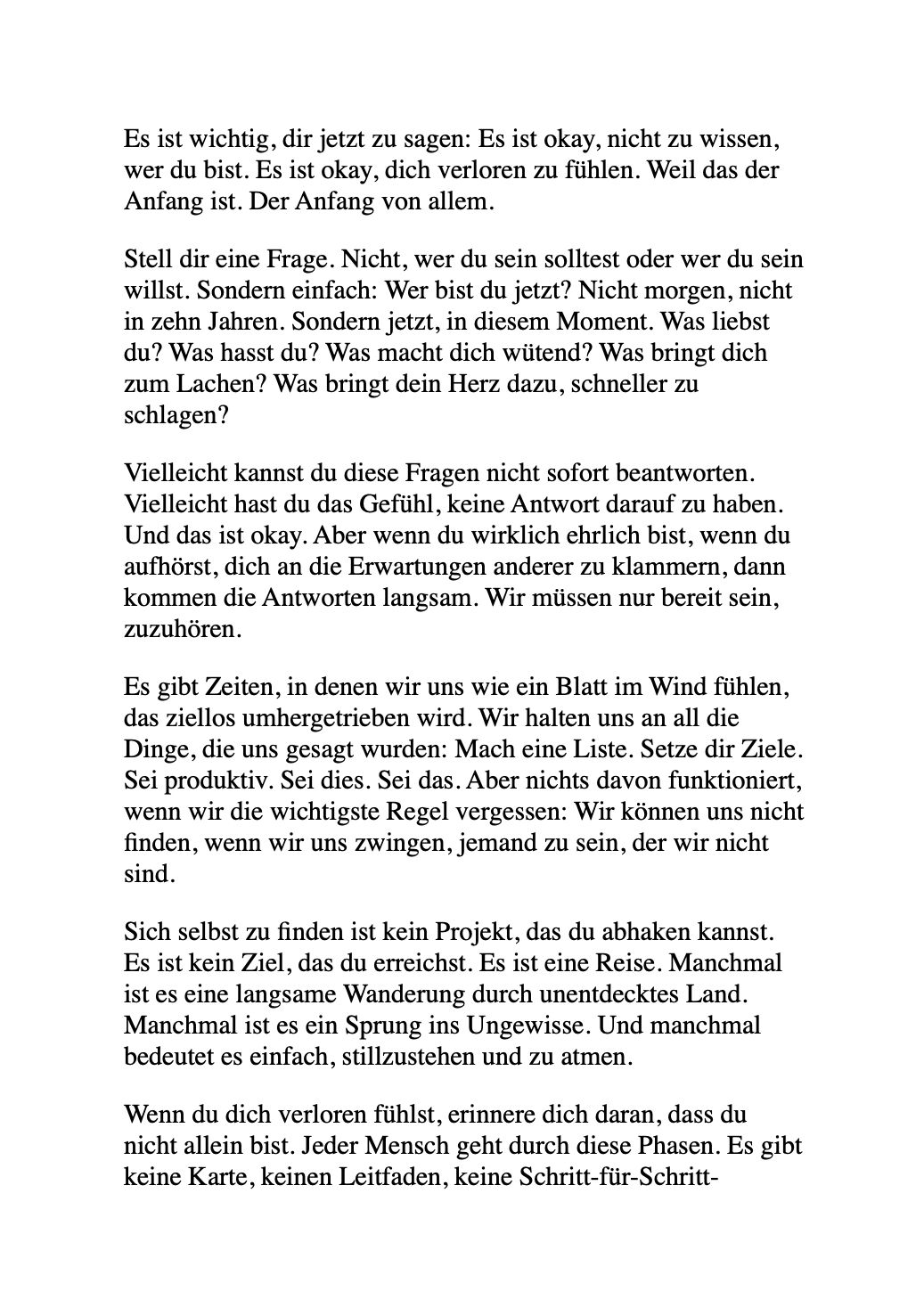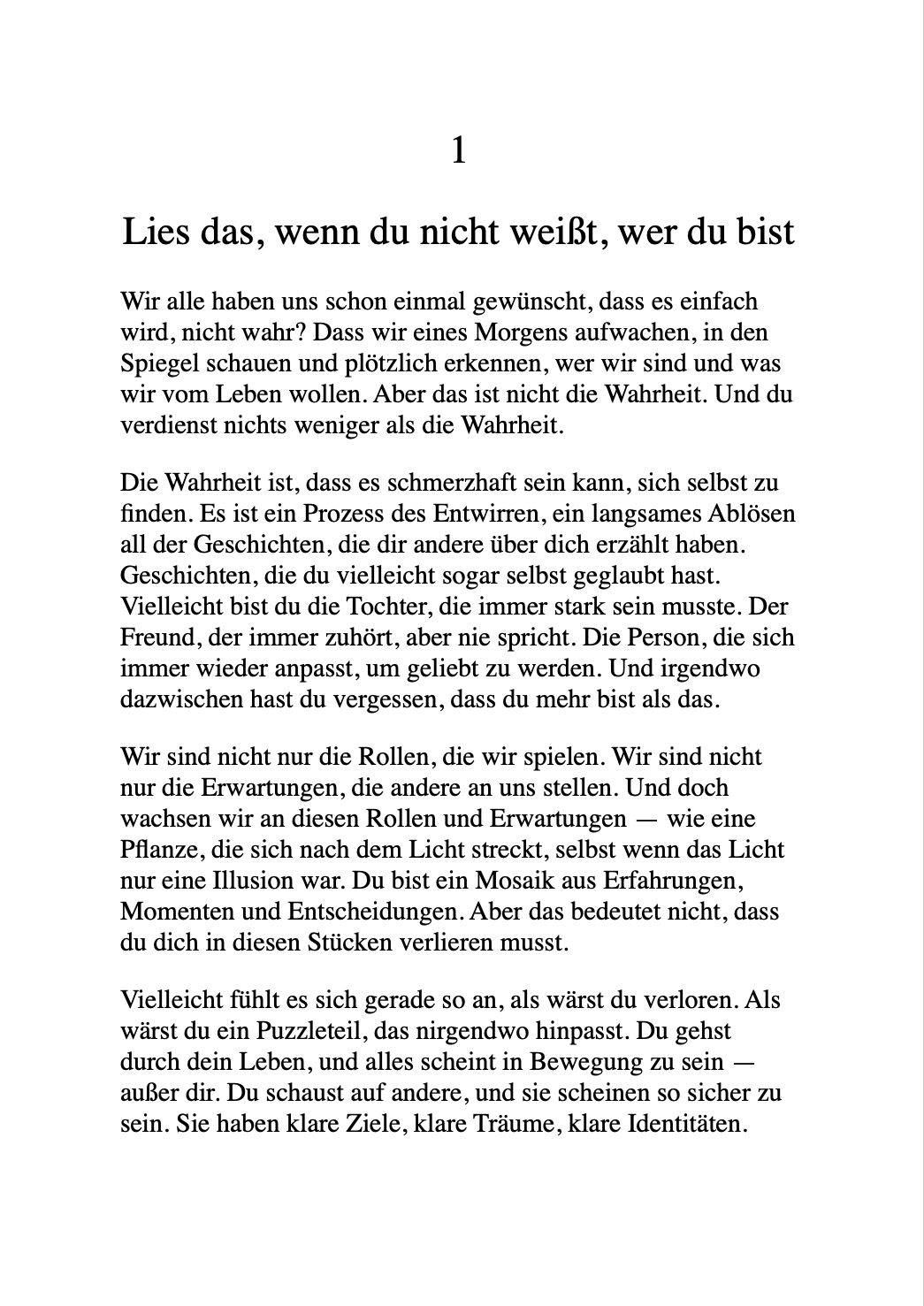 Wer bin ich wirklich? Diese Frage schreit nicht. Sie flüstert. In stillen Momenten. In scheinbar perfekten Tagen, die sich leer anfühlen. In Gedanken, die immer wiederkehren leise, ehrlich, hartnäckig. Dieses Buch ist keine Anleitung. Es ist eine Einladung zu ...