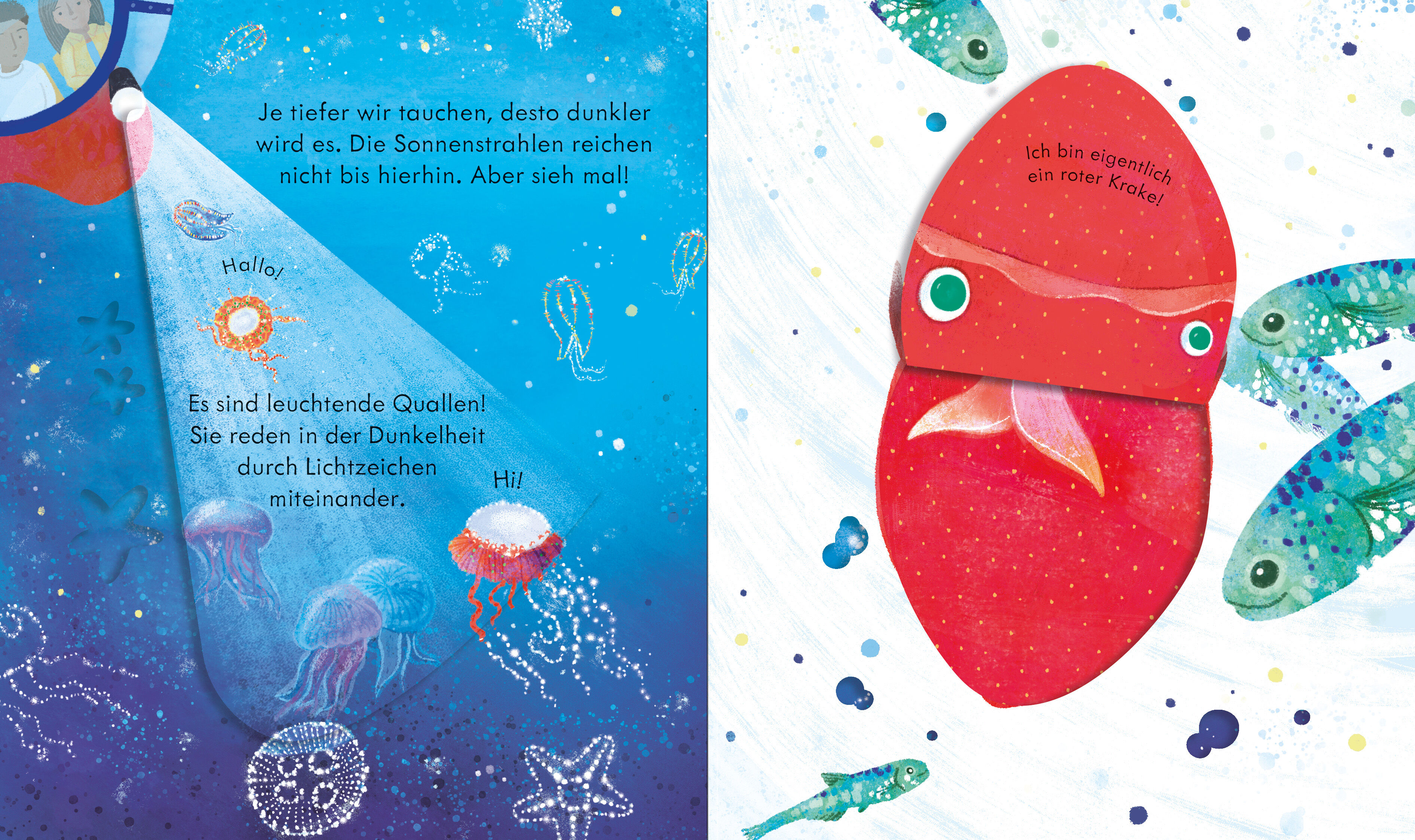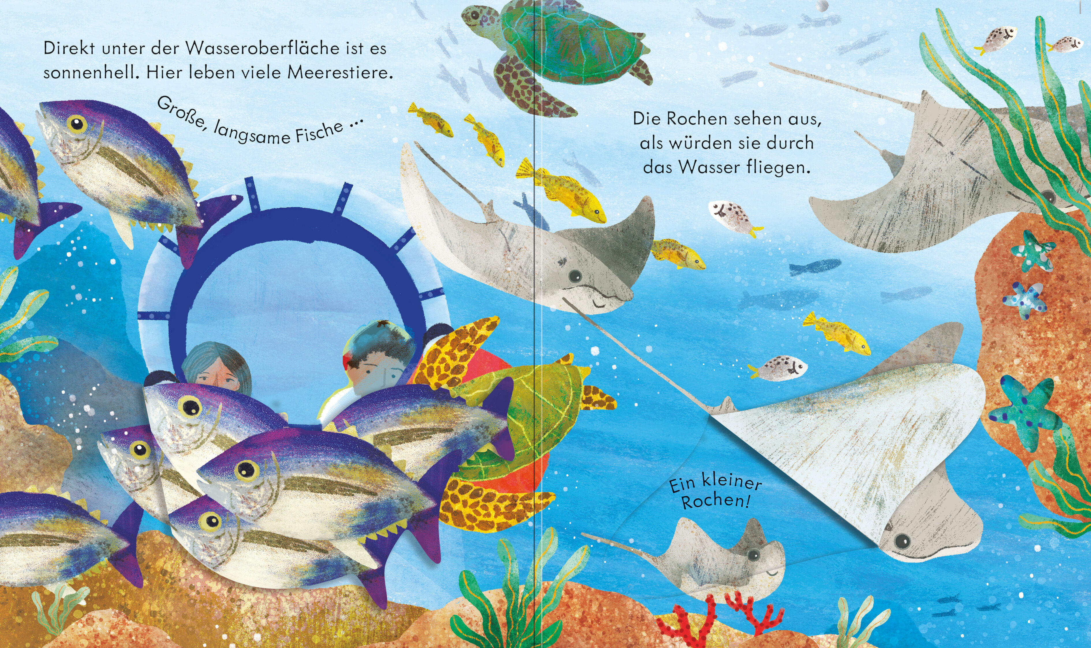 Reise in einem Tauchboot durch den Ozean. Von der Wasseroberfläche bis zum tiefen, dunklen Meeresgrund überall tummelt sich Leben. Sieh durch Gucklöcher und hinter Klappen und entdecke Rochen, Schildkröten, Quallen und viele andere Meeresbewohner. Abtauchen un...