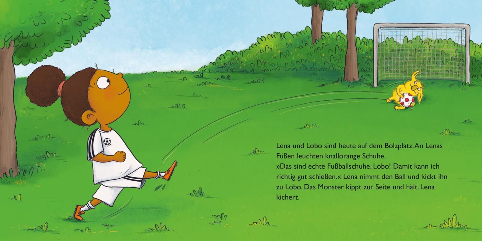 Ein spannendes Bilderbuchabenteuer für alle kleinen Fußballfans Heute treffen sich Lena und ihr Kuschelmonster Lobo mit Nils und Matti auf dem Bolzplatz. Lena will ihre neuen Fußballschuhe ausprobieren. Sie trifft den Ball genau in der Mitte. Wie eine Rakete ...