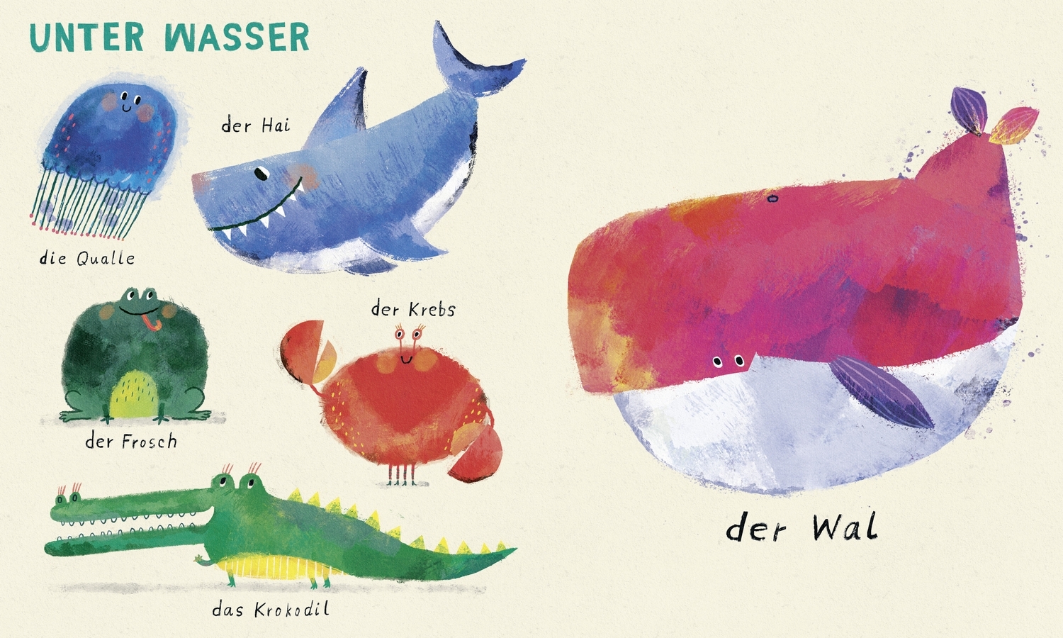 Wie heißt du, kleiner Fisch, mit den wunderschönen großen Augen? Bildwörterbücher sind langweilig? Dieses hier zeigt, dass es auch anders geht. Anna Süßbauer illustriert alle Tiere auf ihre ganz besondere, unverwechselbare Art. Der Wal hat bunte Füße, der rot...