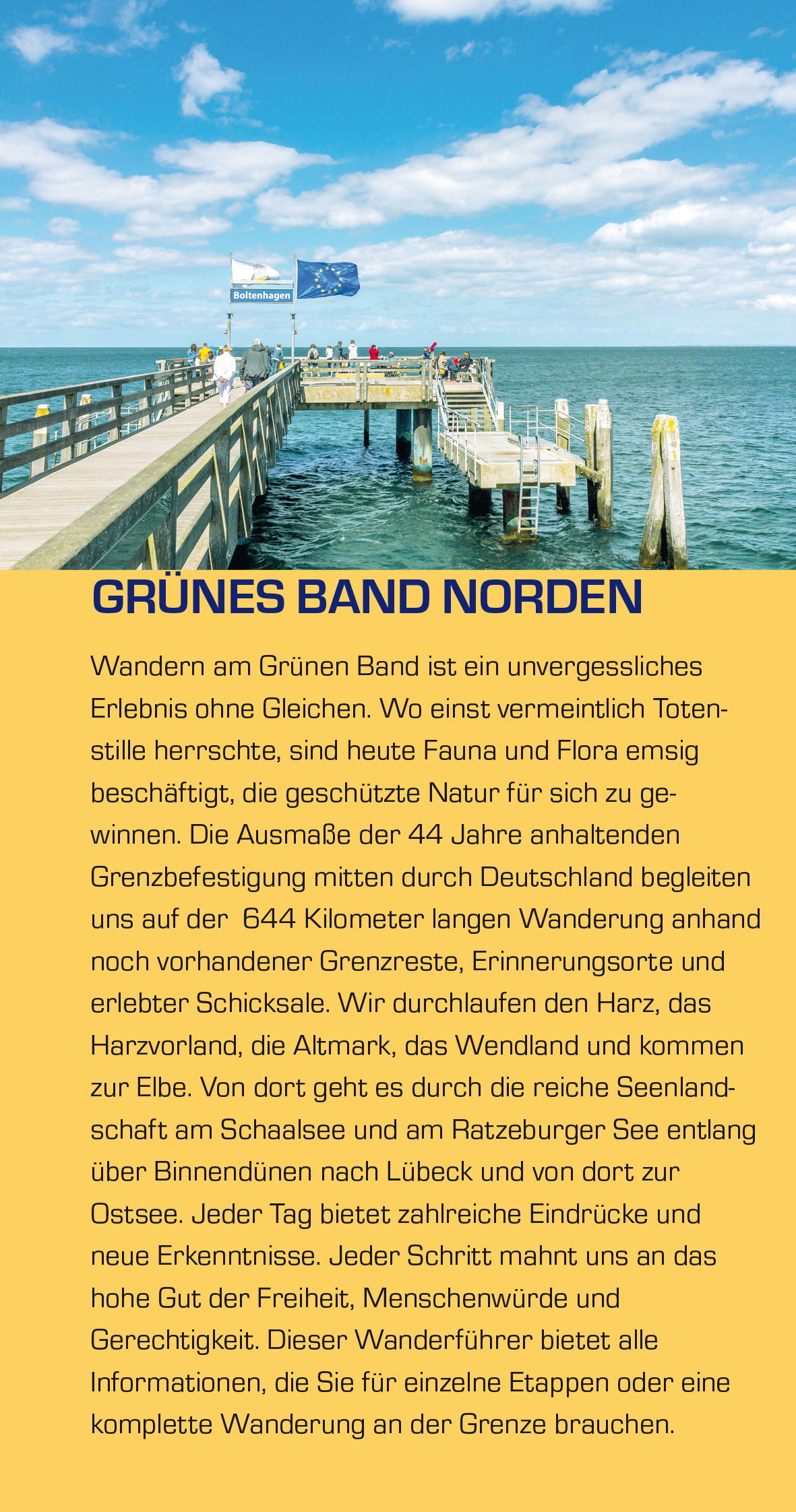 Tour 3, 12, 20, 30 ALTE UND NEUE GRENZBEFESTIGUNGEN Festungen, Wallanlagen und Hochsicherheitstrakte > Tour 21, 14, 28, 32 STANDHAFTE ZEUGEN DER JAHRHUNDERTE Klöster, Fachwerk, Gutshäuser > Tour 1, 6, 32 KRANICHE, BIBER UND SEEADLER Seltene Tiervielfalt am Grünen Band > Tour 12 und 21 SCHICKSALE HÜBEN UND DRÜBEN Gescheiterte und geglückte Fluchten > Tour 2, 29 und 32 VERSCHWUNDENE ORTE Jahrsau, Stresow, Lankow, Lenschow > Tour 18, 19, 30, 31 KUNST- UND KULTURGESCHICHTE Erinnerungen aus Glas, Stein und Metall > Tour 5, 6, 23, 31 Wandern am Grünen Band ist ein unvergessliches Erlebnis ohne Gleichen. Wo einst vermeintlich Totenstille herrschte, sind heute Fauna und Flora emsig beschäftigt, die geschützte Natur für sich zu gewinnen. Die Ausmaße der 44 Jahre anhaltenden Grenzbefestigung mitten durch Deutschland begleiten uns auf der 644 Kilometer langen Wanderung anhand noch vorhandener Grenzreste, Erinnerungsorte und erlebter Schicksale. Wir durchlaufen den Harz, das Harzvorland, die Altmark, das Wendland und kommen zur Elbe. Von dort geht es durch die reiche Seenlandschaft am Schaalsee und am Ratzeburger See entlang über Binnendünen nach Lübeck und von dort zur Ostsee. Jeder Tag bietet zahlreiche Eindrücke und neue Erkenntnisse. Jeder Schritt mahnt uns an das hohe Gut der Freiheit, Menschenwürde und Gerechtigkeit. Dieser Wanderführer bietet alle Informationen, die Sie für einzelne Etappen oder eine komplette Wanderung an der Grenze brauchen. >>> Den dieses Buch ergänzenden Reiseführer zum südlichen Abschnitt des Grünen Bands finden sie auf der Website des Trescher Verlags.