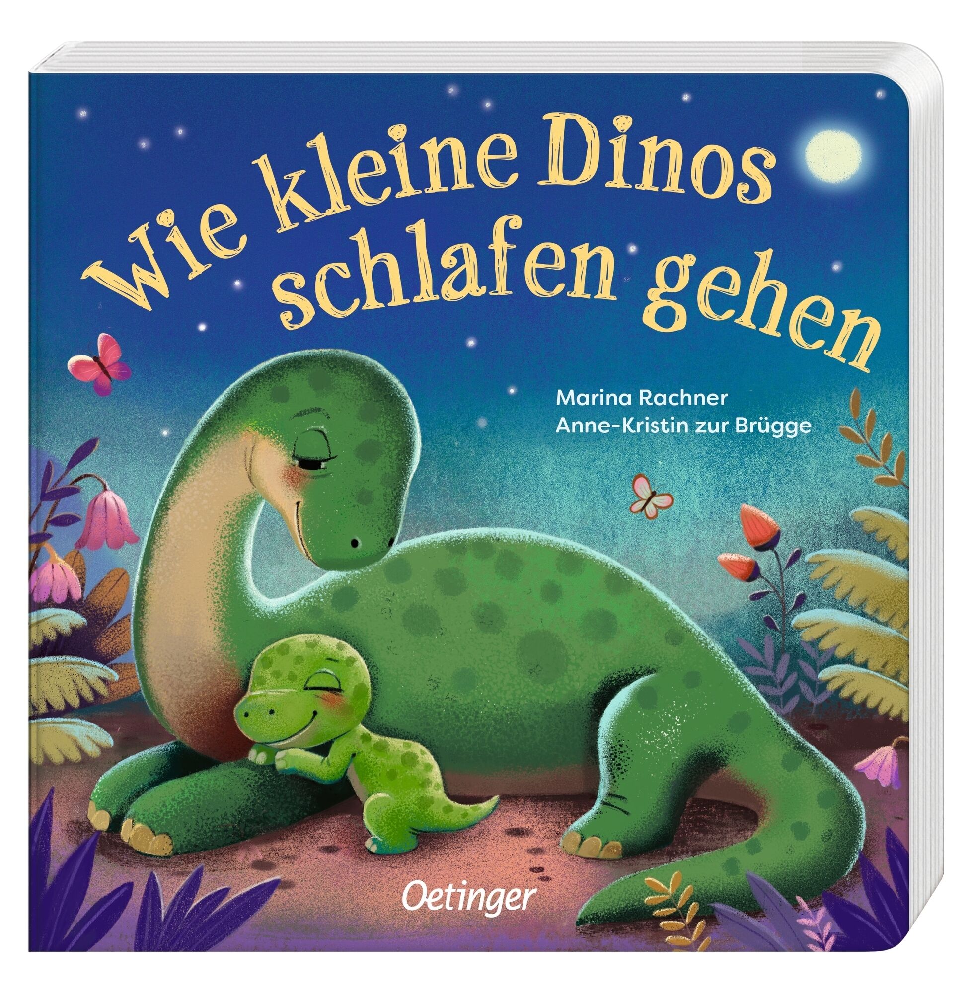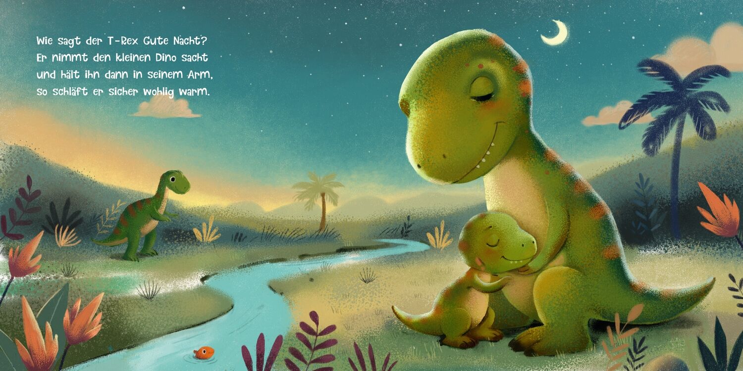 Wie sagen kleine Dinos Gute Nacht? Was macht der kleine Langhals, bevor er glücklich einschläft? Und mit wem kuschelt der kleine Triceratops am liebsten? Die Dino-Babys und ihre Eltern kuscheln am Abend vor dem Einschlafen genauso gern wie kleine Menschenkinder.