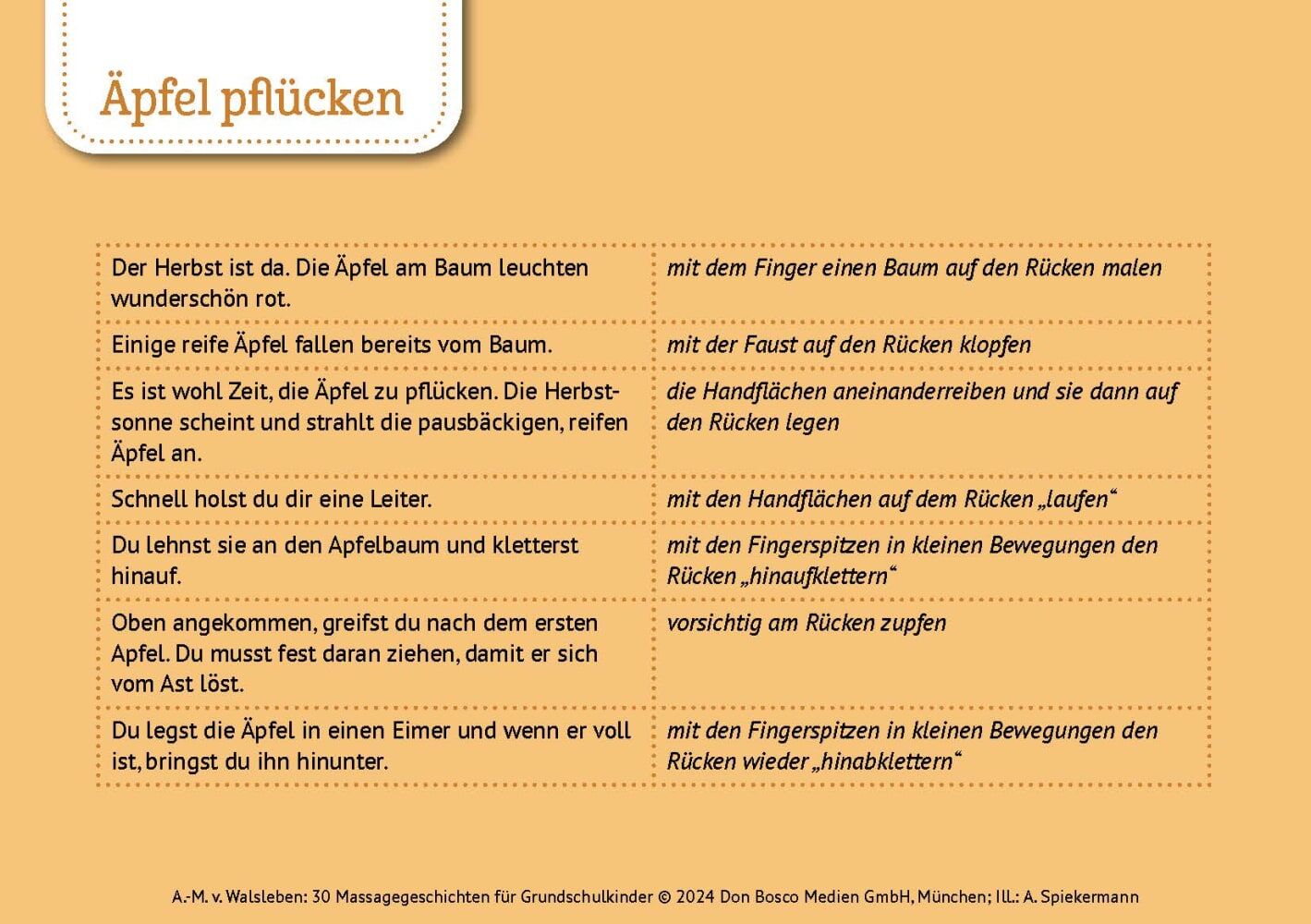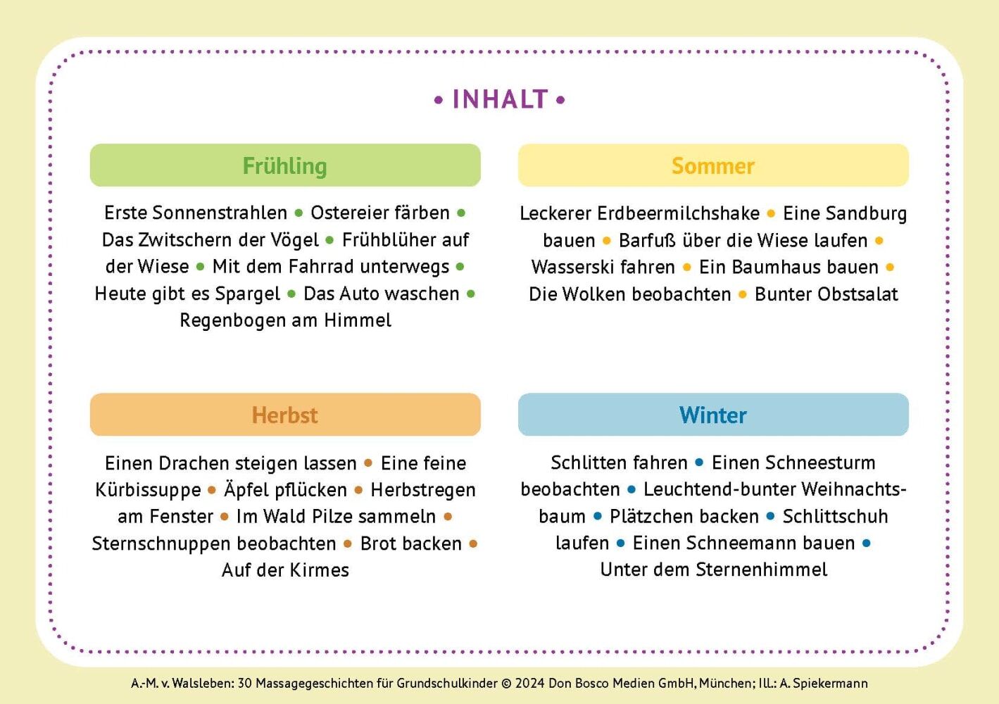 Sozialkompetenz und Körperwahrnehmung fördern: Bildkarten mit Massagegeschichten zu Frühling, Sommer, Herbst und Winter für Schulalltag und Kinderturnen Entspannungsmassagen für Kinder passend zu den Jahreszeiten Erste Sonnenstrahlen, Bunter Obstsalat oder Plä...