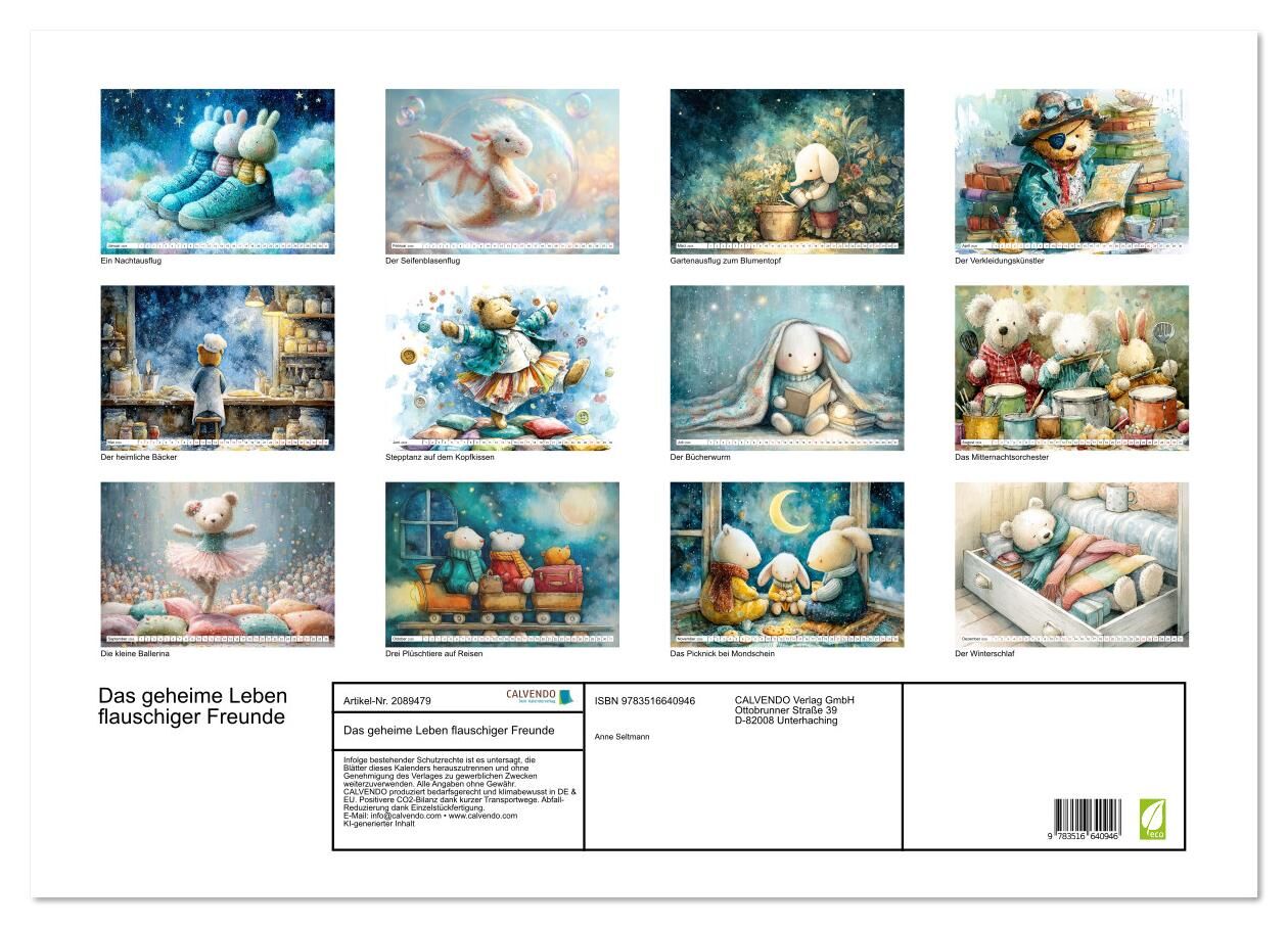 Wenn alle schlafen, oder das Haus verlassen haben, beginnt das Abenteuer! Dieser liebevoll mit KI gestaltete Kinderkalender zeigt auf humorvolle und poetische Weise, was Kuscheltiere so alles treiben. Ob beim heimlichen Lesen unter der Decke oder auf Reisen im...