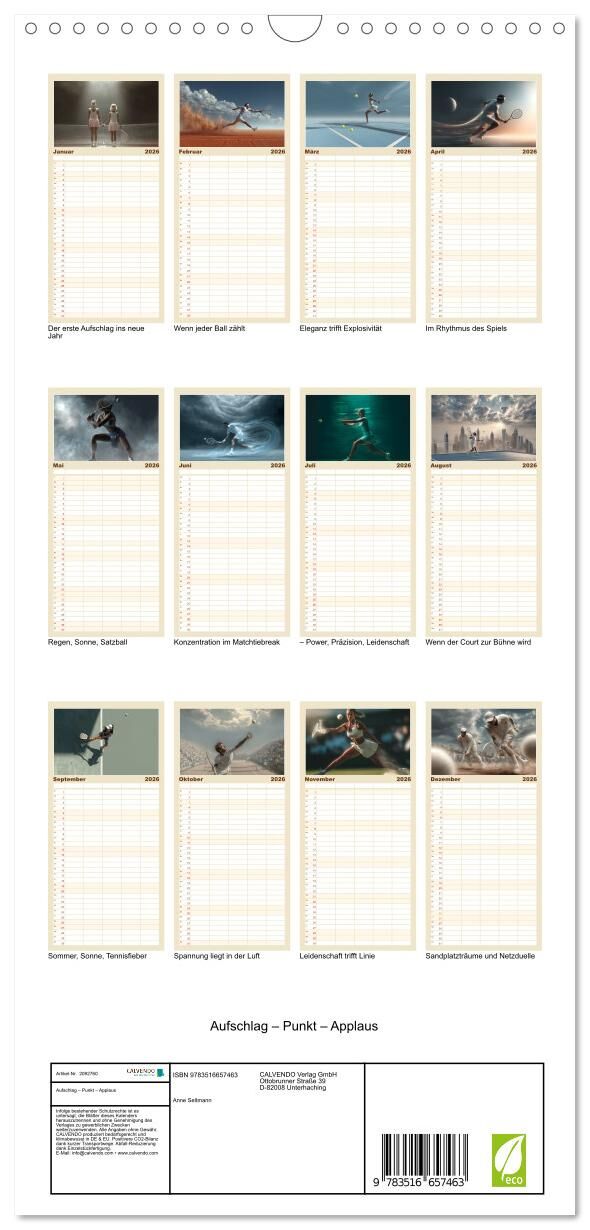 Kraftvoll, präzise, voller Leidenschaft dieser Kalender zeigt faszinierende Tennis-Motive, die den Sport aus ungewohnter Perspektive beleuchten. Ob Aufschlag, Rückhand oder der entscheidende Matchball: Jedes Bild fängt die Spannung und Dynamik des Spiels ein. ...