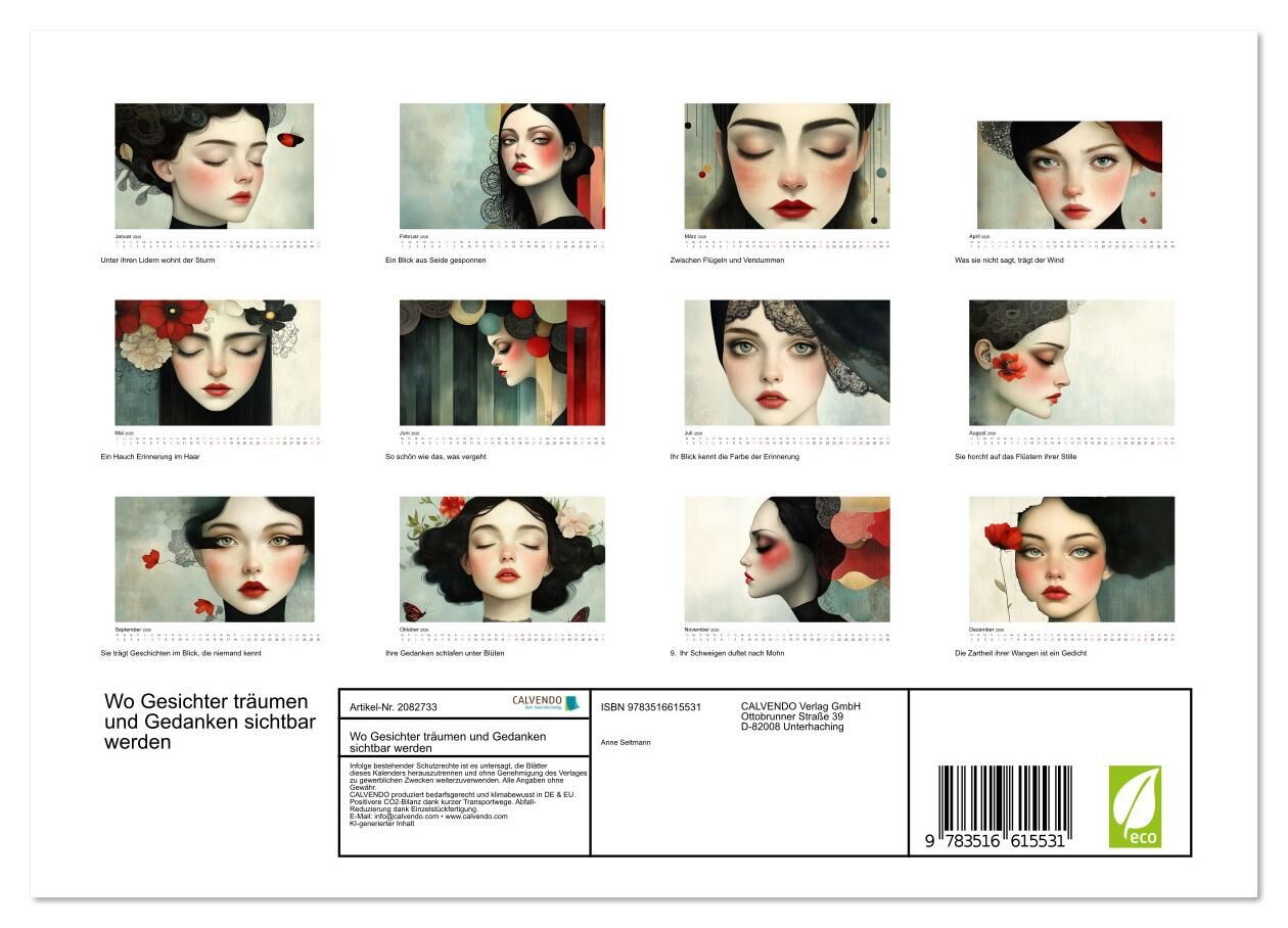 Dieser außergewöhnliche Kalender präsentiert 12 kunstvoll mit KI generierte Frauenporträts, die gleichermaßen fragil und kraftvoll erscheinen. Jede Figur erzählt durch Mimik, Farbe, florale Elemente und geheimnisvolle Details eine stille Geschichte zwischen Tr...
