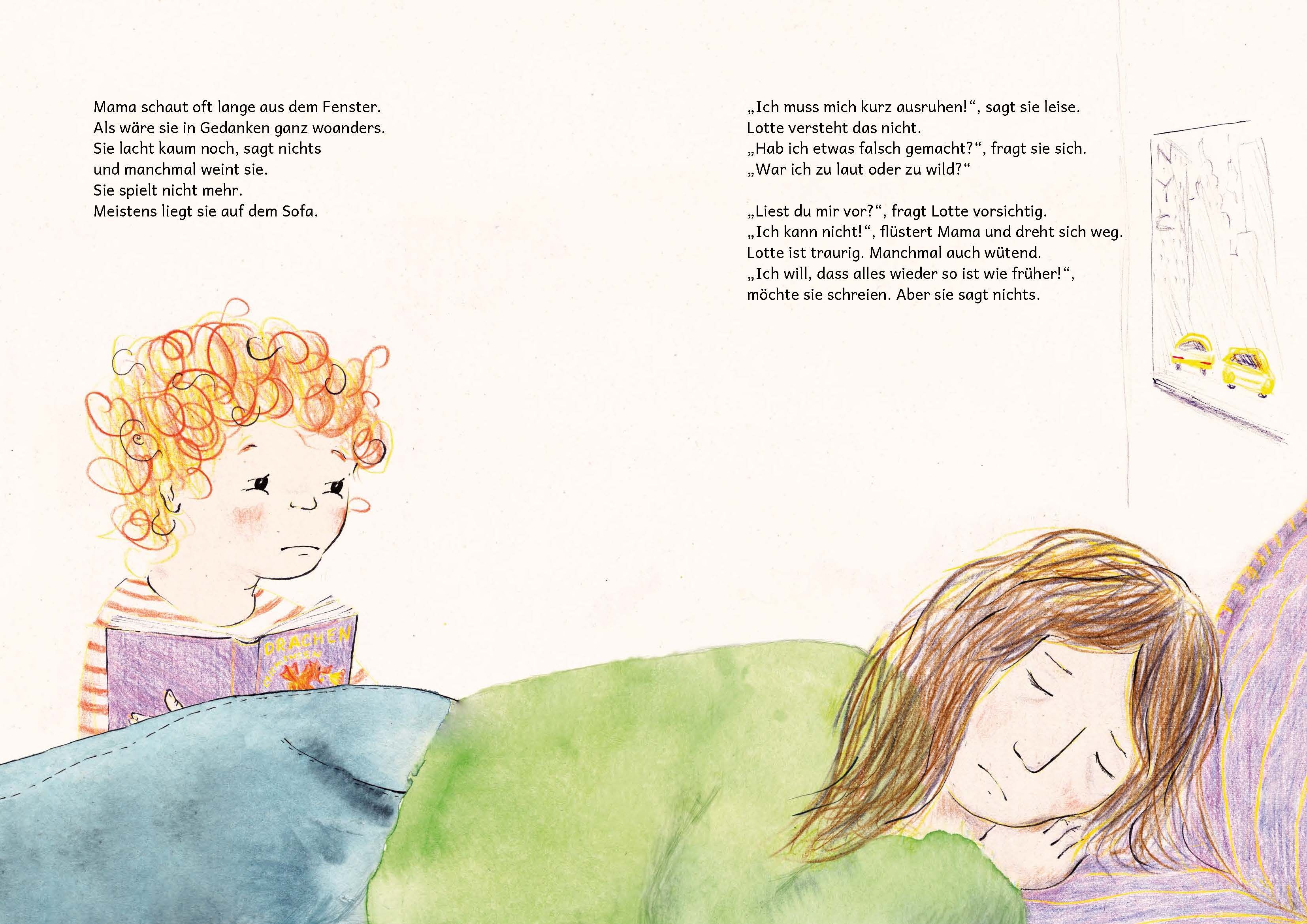 Lotte ist vier Jahre alt. Sie liebt Drachen, Krokodile und ganz besonders, sich mit Mama und Papa Geschichten auszudenken. Doch plötzlich verändert sich Mama: Sie zieht sich zurück, liegt oft im Dunkeln, lacht nicht mehr. Papa erklärt, dass "Mamas Akku" kaputt...