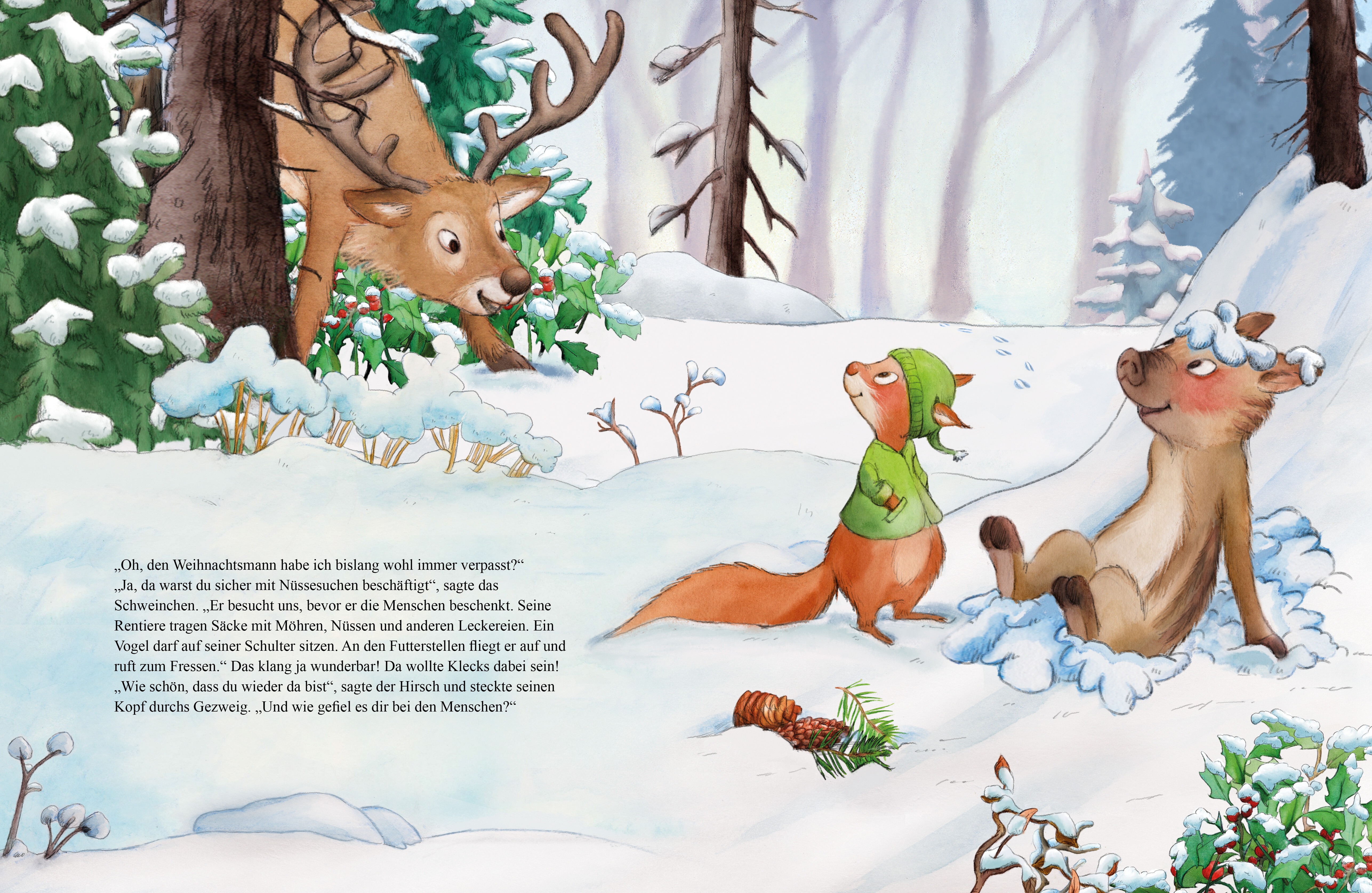 Als der erste Schnee fällt, freuen sich alle Waldtiere auf das Weihnachtsfest und die Bescherung. Da erzählt Eichhörnchen Klecks, was es bei den Menschen erlebt hat: Anders als die Tiere bereiten Menschenkinder dem Weihnachtsmann eine kleine Überraschung. Das ...