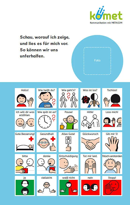 Umfangreiches Kommunikationsbuch im Taschenbuchformat Das komet Kommunikationsbuch mit METACOM Symbolen ist handlich klein und bietet dennoch einen umfangreichen Wortschatz von ca. 800 Wörtern und Aussagen. Neu und einzigartig ist der geteilte Aufbau, durch de...