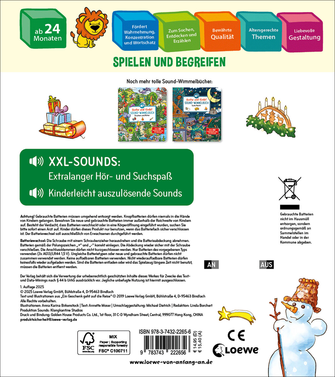 Suche und finde! Höre und staune! Was passiert, wenn lebendige Klangwelten auf spannende Wimmelbilder treffen? Ein einzigartiges Erlebnis für Kinder ab 2 Jahren! Über 60 Geräusche und Suchbilder, stimmungsvolle Musik und lange, authentische Dialoge erwecken wunderschöne Wimmelszenen zum Leben. Einfach auszulösende Sound-Buttons ermöglichen auch den Kleinsten spielerische Erfolgserlebnisse, während das Zuordnen der Geräusche zum Bild die Konzentration fördert und die Sinne anregt. Sehen und Hören, Suchen und Staunen - Die Suche und finde! Sound-Wimmelbücher sorgen für spannende und langanhaltende Beschäftigung. Lieblings-Themenwelten wie Gute Nacht, Natur, Weihnachten, Feuerwehr oder Drachen und Ritter wecken die Entdeckerlust und bieten unzählige Gesprächsanlässe. Wimmelige Bilder zum Immer-wieder-Anschauen, extralange Sounds und viele Suchvignetten auf jeder Doppelseite machen die Bücher zu unterhaltsamen Begleitern. Garantierter Spiel- und Lesespaß mit wichtigem Lerneffekt für Kinder ab 2 Jahren bis ins Vorschulalter! - Pappbilderbuch mit Sounds ab 2 Jahren - Extralange Sounds mit bis zu 260 Sekunden Gesamtspielzeit - Ultimativer Wimmelspaß mit XXL-Sounds - Sound-Buttons sind schon für die Allerkleinsten mühelos auslösbar - Wimmelbuch-Erlebnis für Augen und Ohren: Mit vielen Suchsounds und Suchbildern auf jeder Seite - Qualität und Sicherheit: aufwendig produzierte Tonspuren, hochwertige Illustrationen, lange Lebensdauer, stabile Seiten, abgerundete Ecken - Mit An/Aus Schalter - Mit enthaltenen Knopfbatterien zum auswechseln - Fördert spielerisch Konzentration und Sprachentwicklung - Sinnvolle, langanhaltende Beschäftigung mit Lerneffekt - Zur Selbstbeschäftigung und zum gemeinsamen Lesen und Spielen