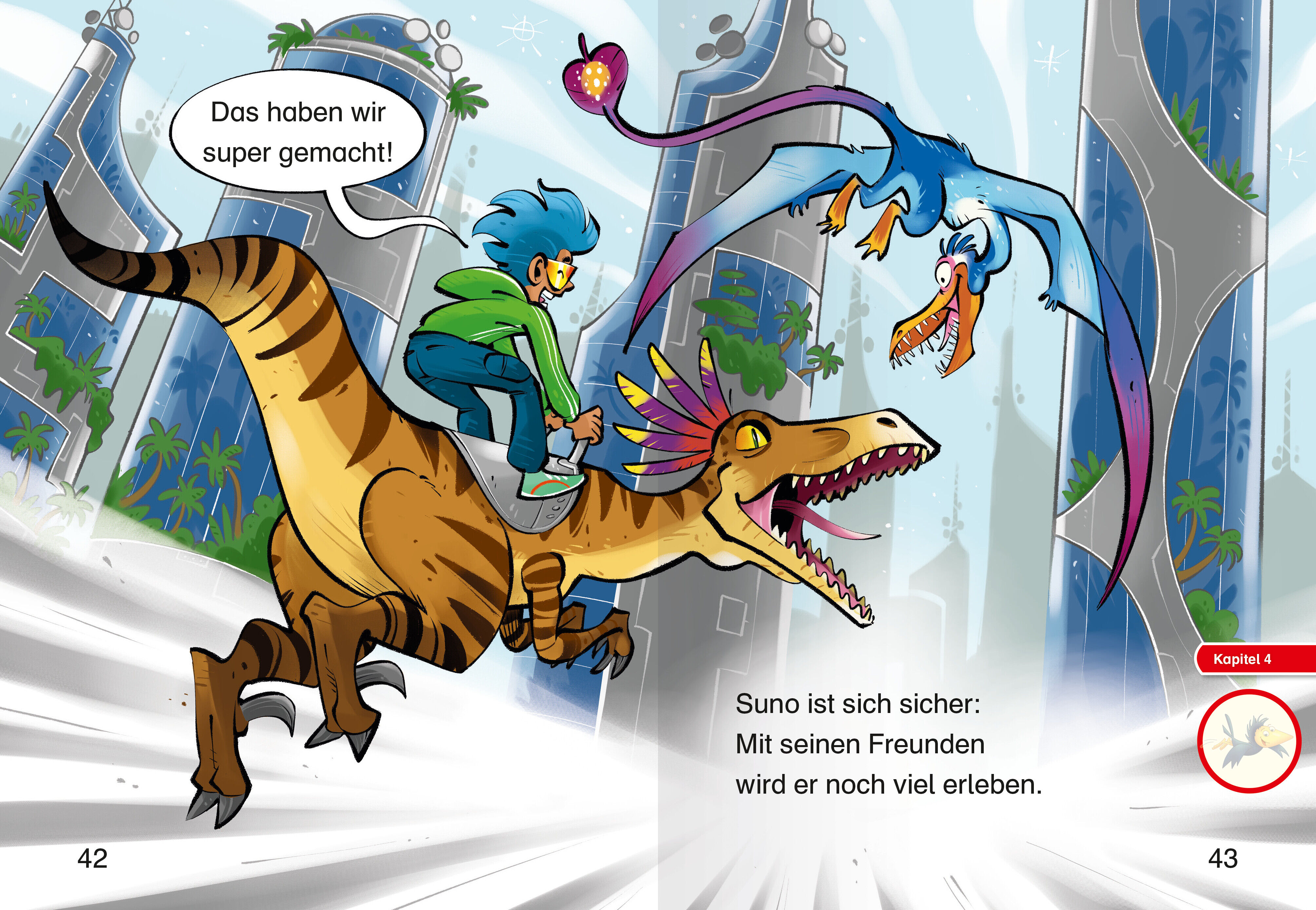 Lesen lernen wie im Flug! Irgendwann in der Zukunft: Suno reitet auf seinem Dinosaurier Rapi durch eine futuristische Stadt. Er sucht seinen Freund, den Dino Foro, der verschwunden ist. Im Park beobachten Suno und Rapi zwei Verdächtige. Die beiden Halunken fan...