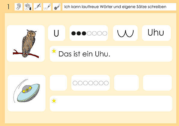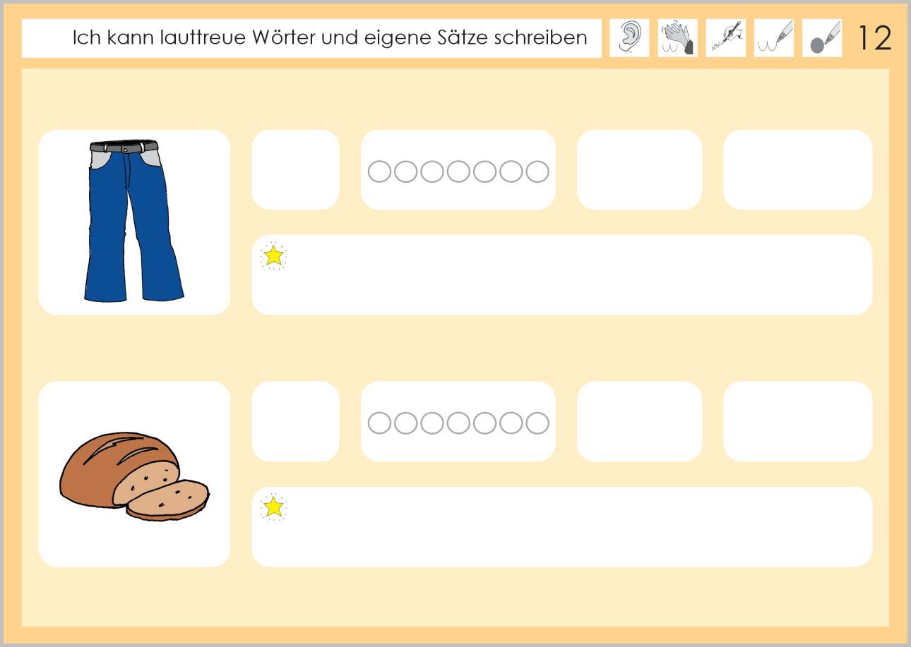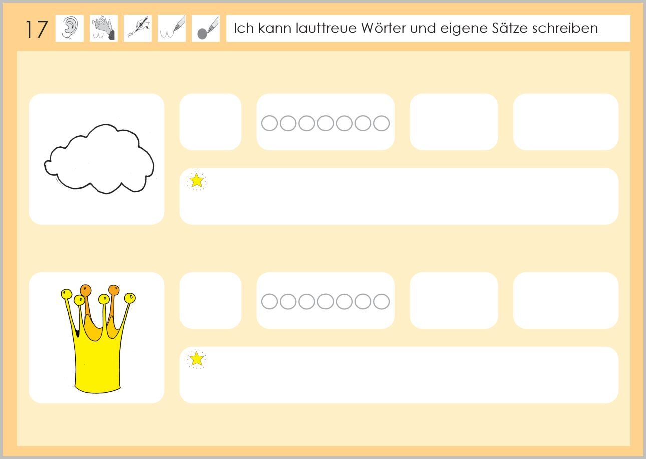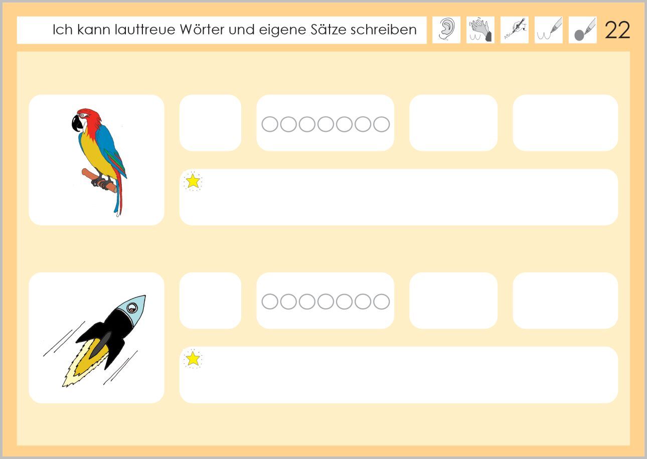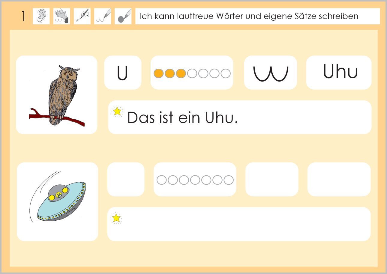 Lernziel: Ich kann lauttreue Wörter und eigene Sätze schreiben. Zunächst schreiben die Kinder den Anlaut, hören die Anzahl der Laute im Wort, bestimmen die Anzahl der Silben und schreiben die Bildwörter auf. Im zweiten Teil des Heftes schreiben sie mit den Bi...