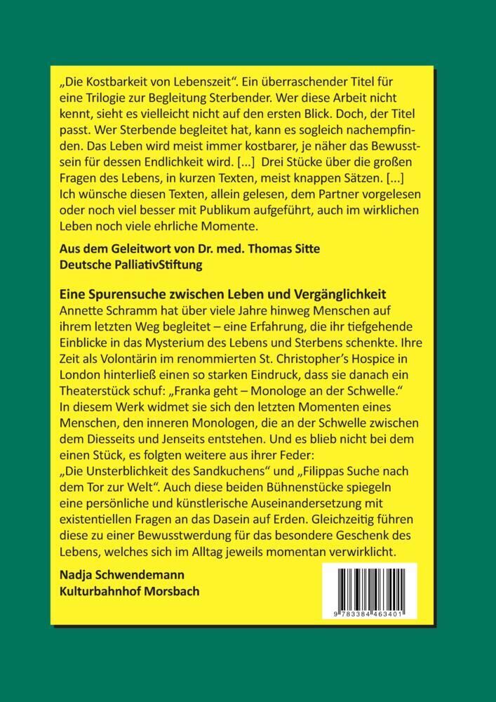 In der Essenz geht es um Vergänglichkeit und Lebenssinn. Die ersten beiden Theaterstücke Franka geht und Die Unsterblichkeit des Sandkuchens beschreiben Lebenswege und Einsichten von Menschen vor ihrem Tod sowie Hinterbliebene im Umgang mit ihrer Trauer. Anges...