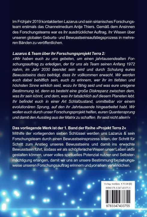 Im Frühjahr 2019 kontaktierten Lazarus und sein sirianisches Forschungsteam erstmals das Channelmedium Antje Thiers. Gemäß dem Ansinnen des Forschungsteams war es ihr ausdrücklicher Auftrag, ihr Wissen über unseren globalen Geburts- und Bewusstseinsaufstiegspr...