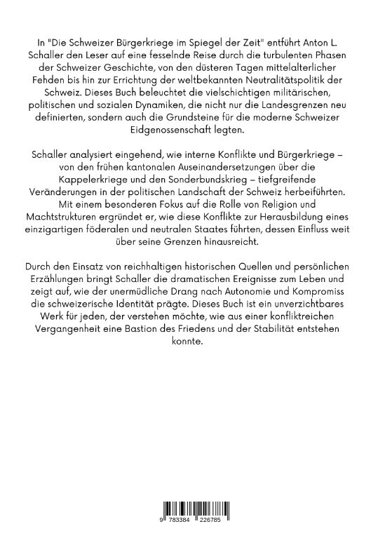In "Die Schweizer Bürgerkriege im Spiegel der Zeit" entführt Anton L. Schaller den Leser auf eine fesselnde Reise durch die turbulenten Phasen der Schweizer Geschichte, von den düsteren Tagen mittelalterlicher Fehden bis hin zur Errichtung der weltbekannten Ne...