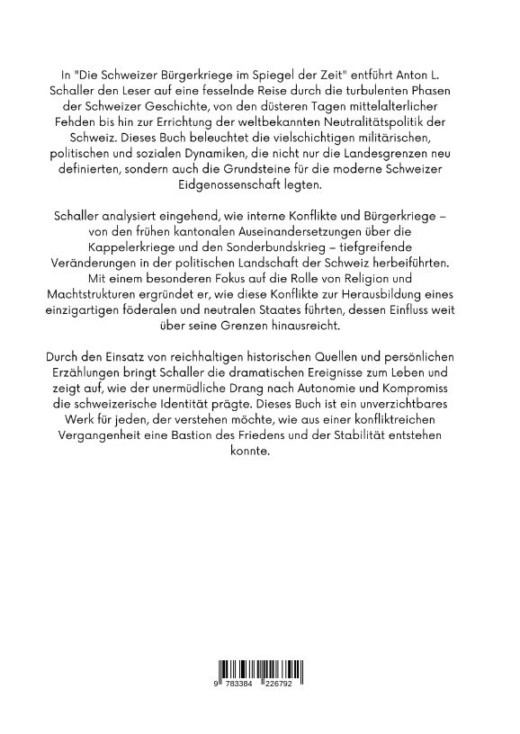 In "Die Schweizer Bürgerkriege im Spiegel der Zeit" entführt Anton L. Schaller den Leser auf eine fesselnde Reise durch die turbulenten Phasen der Schweizer Geschichte, von den düsteren Tagen mittelalterlicher Fehden bis hin zur Errichtung der weltbekannten Ne...