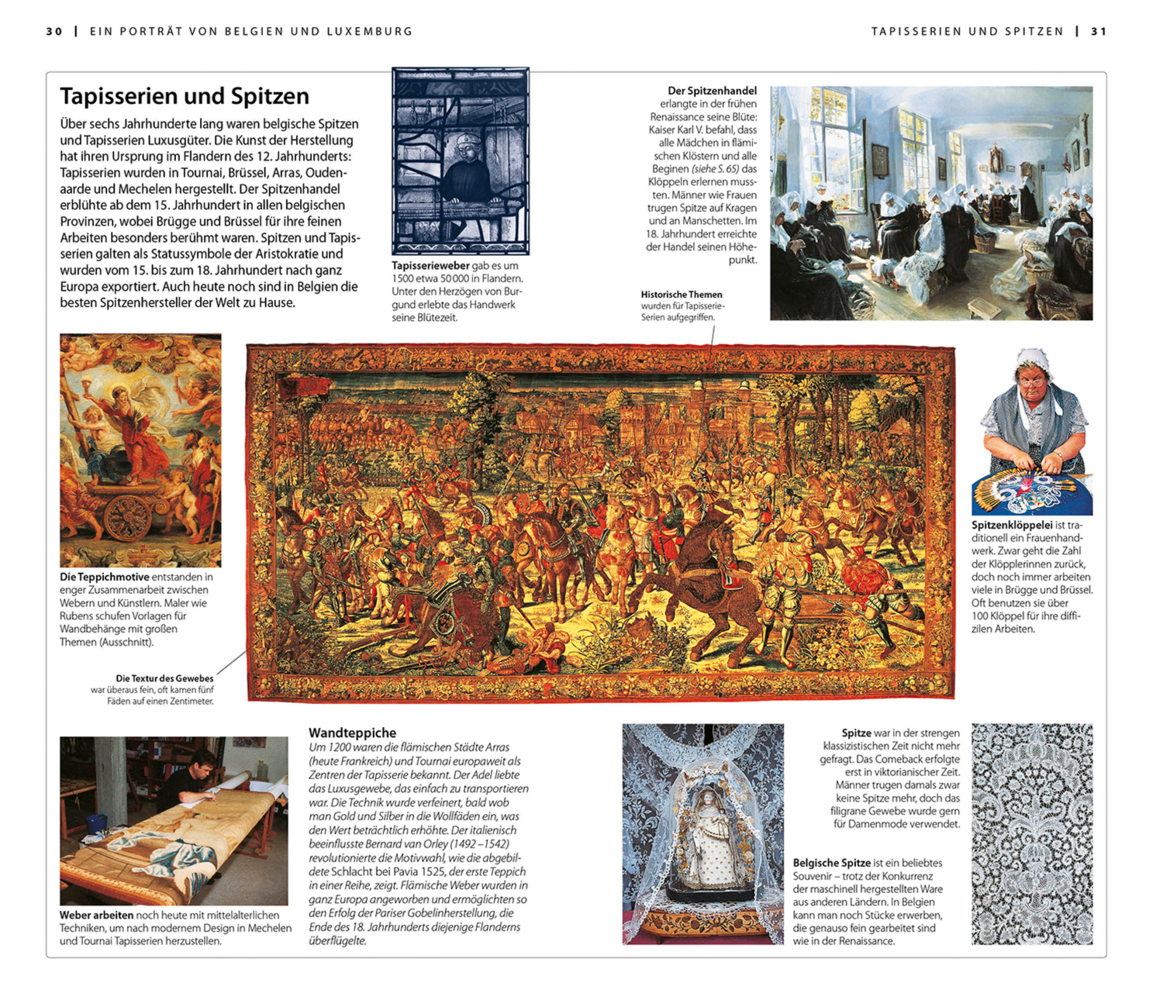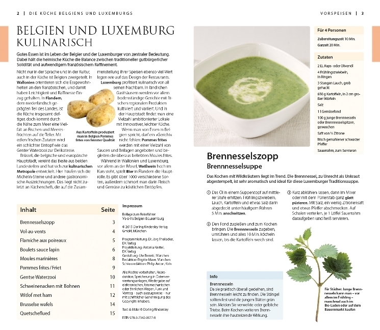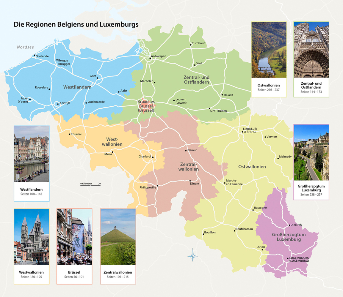 Belgien und Luxemburg stellen sich vor: Belgien und Luxemburg entdecken Belgien und Luxemburg auf der Karte Ein Porträt von Belgien und Luxemburg Das Jahr in Belgien und Luxemburg Die Geschichte Belgiens Die Regionen Belgiens und Luxemburgs: Belgien und Luxemburg im Überblick Brüssel Flandern: Westflandern Zentral- und Ostflandern Wallonien: Westwallonien Zentralwallonien Ostwallonien Großherzogtum Luxemburg Zu Gast in Belgien und Luxemburg: Hotels Restaurants Shopping in Belgien Unterhaltung in Belgien Shopping und Unterhaltung in Luxemburg Sport und Aktivurlaub Grundinformationen: Praktische Hinweise Reiseinformationen Textregister Danksagung und Bildnachweis Sprachführer Straßenkarte
