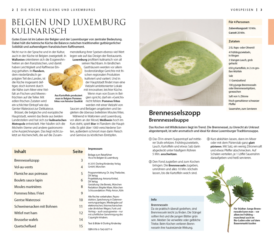 Belgien und Luxemburg verbindet eine lange gemeinsame Geschichte und beide pflegen eine sehr herzliche Gastfreundschaft. Sie begeistern durch ihre Kunst und Kultur und nicht zuletzt auch durch kulinarische Spezialitäten wie die berühmte belgische Schokolade. Im Vis-à-Vis Belgien & Luxemburg finden Sie für jedes Vorhaben alle Informationen, die Sie benötigen: vom Hotel im ehemaligen Kloster in Brügge über das kleine belgische Restaurant in Marchin bis zum Printemps Musical-Festival de Luxembourg. In umfangreichen Kapiteln zu Brüssel, Antwerpen, Gent und den einzelnen Regionen werden alle Seiten der Länder vorgestellt. Dank sechsseitigem Stadtplan finden Sie sich mühelos in Brüssel zurecht. Viele wichtige Sehenswürdigkeiten wie das Musée Horta in Brüssel, das Rubenshuis in Antwerpen oder die Cathédrale Notre-Dame in Tournai werden anhand von Aufrisszeichnungen detailliert beschrieben. Außerdem gibt es für Genießer ausführliche Hinweise zu belgischen Spezialitäten wie Pralinen, Waffeln, Muscheln, Pommes und Bier. Erstmalig bei einem Reiseführer gibt es ein Mini-Kochbuch zum Herausnehmen mit typischen Gerichten des Landes. Die hervorragenden Abbildungen - exakte Schnittzeichnungen, dreidimensionale Grundrisse, Übersichtskarten und Stadtpläne - erleichtern Ihnen die Orientierung vor Ort. Der ausführliche Praxisteil bietet aktuelle Angaben zu Hotels, Restaurants, Shopping, Nachtleben und Unterhaltung sowie praktische Tipps zu Verkehrsmitteln, Öffnungszeiten und vieles mehr.