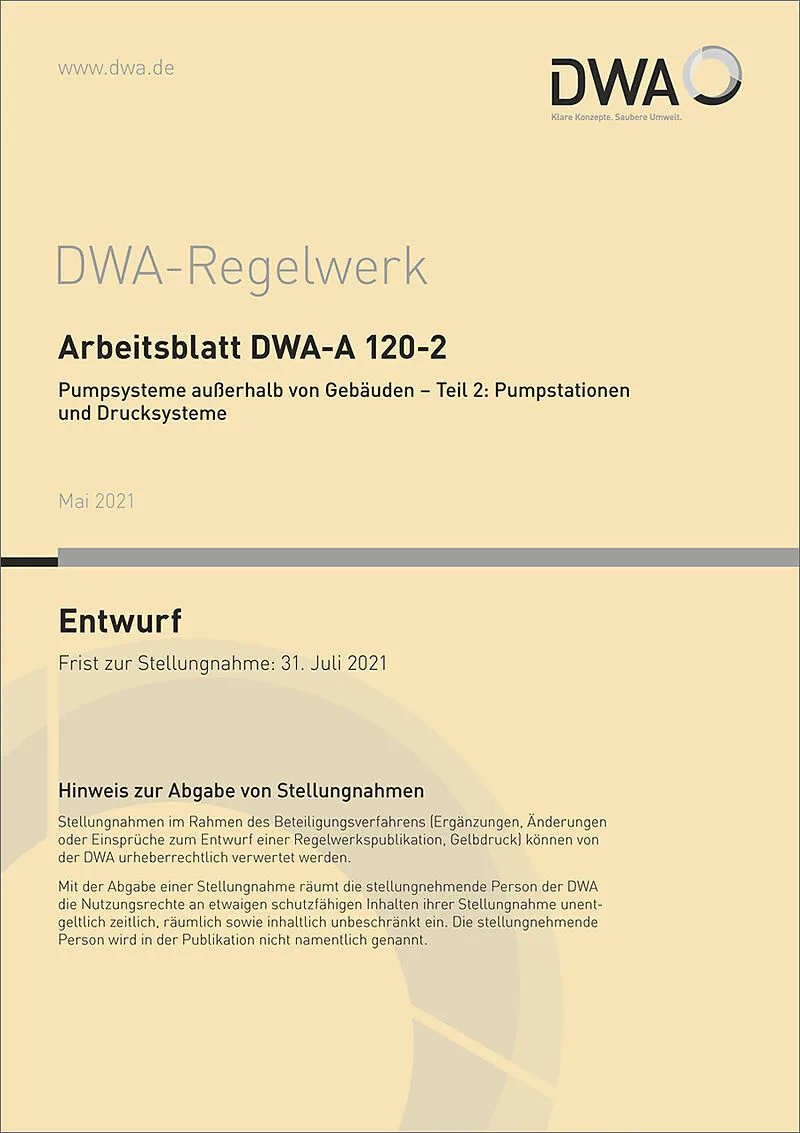 Das Arbeitsblatt DWA-A 120-2 ergänzt DIN EN 16932-2 Entwässerungssysteme außerhalb von Gebäuden - Pumpsysteme - Teil 2: Druckentwässerungssysteme und gilt nur in Verbindung mit dieser Norm. Im Arbeitsblatt werden die Hinweise aus der Norm mit weiteren Empfehlu...