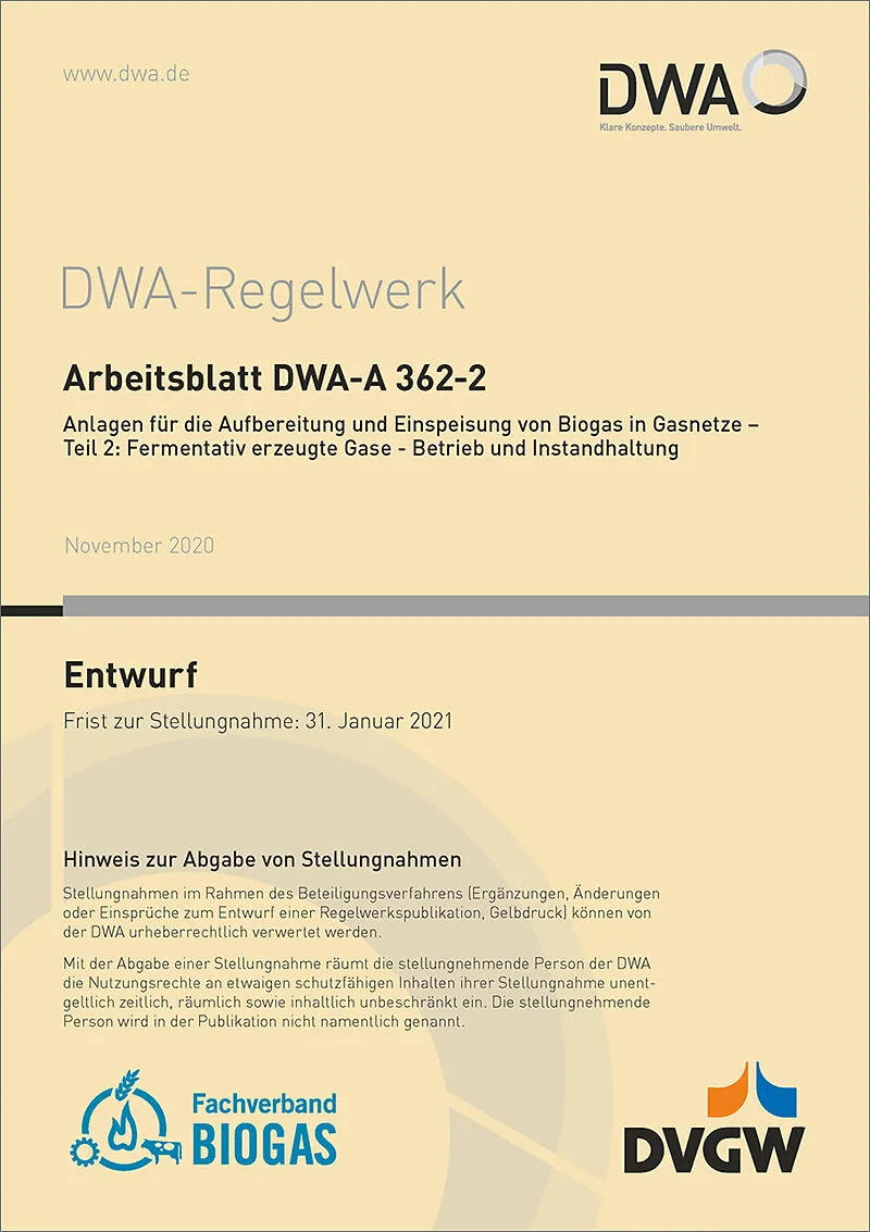 Dieses Arbeitsblatt dient als Grundlage für den Betrieb von Biogas-Aufbereitungs- und Biogas-Einspeiseanlagen, Einspeiseanlagen für Wasserstoff oder synthetisches Methan sowie für Rückspeiseanlagen. Einen Schwerpunkt bilden die für die Gewährleistung einer höc...