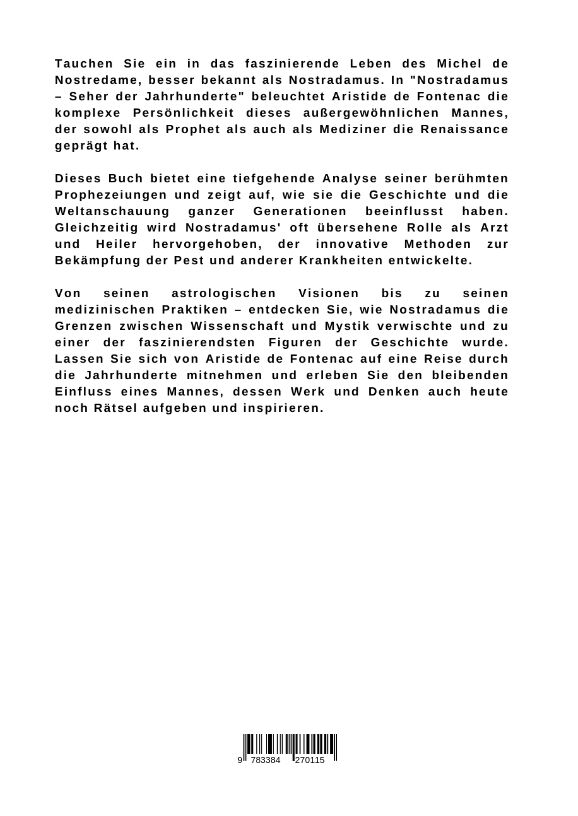 Tauchen Sie ein in das faszinierende Leben des Michel de Nostredame, besser bekannt als Nostradamus. In "Nostradamus Seher der Jahrhunderte" beleuchtet Aristide de Fontenac die komplexe Persönlichkeit dieses außergewöhnlichen Mannes, der sowohl als Prophet als...