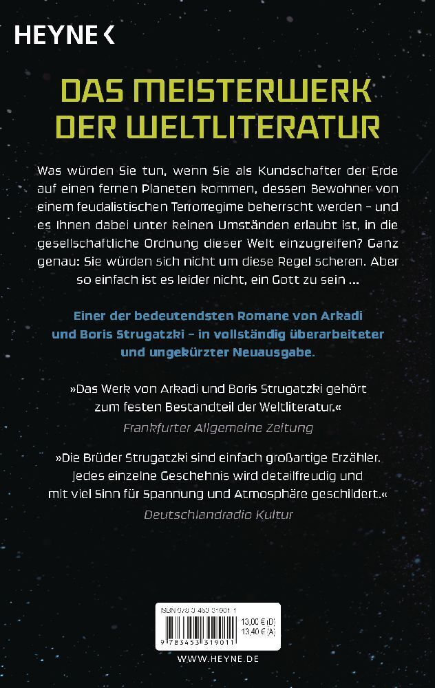 Arkadi und Boris Strugatzki sind nicht nur Autoren von Weltrang, sondern auch Vordenker einer systemkritischen Literatur. Es ist schwer, ein Gott zu sein , 1964 geschrieben, erzählt die Geschichte von Anton, der auf einem fremden, rückständigen Planeten gottgl...