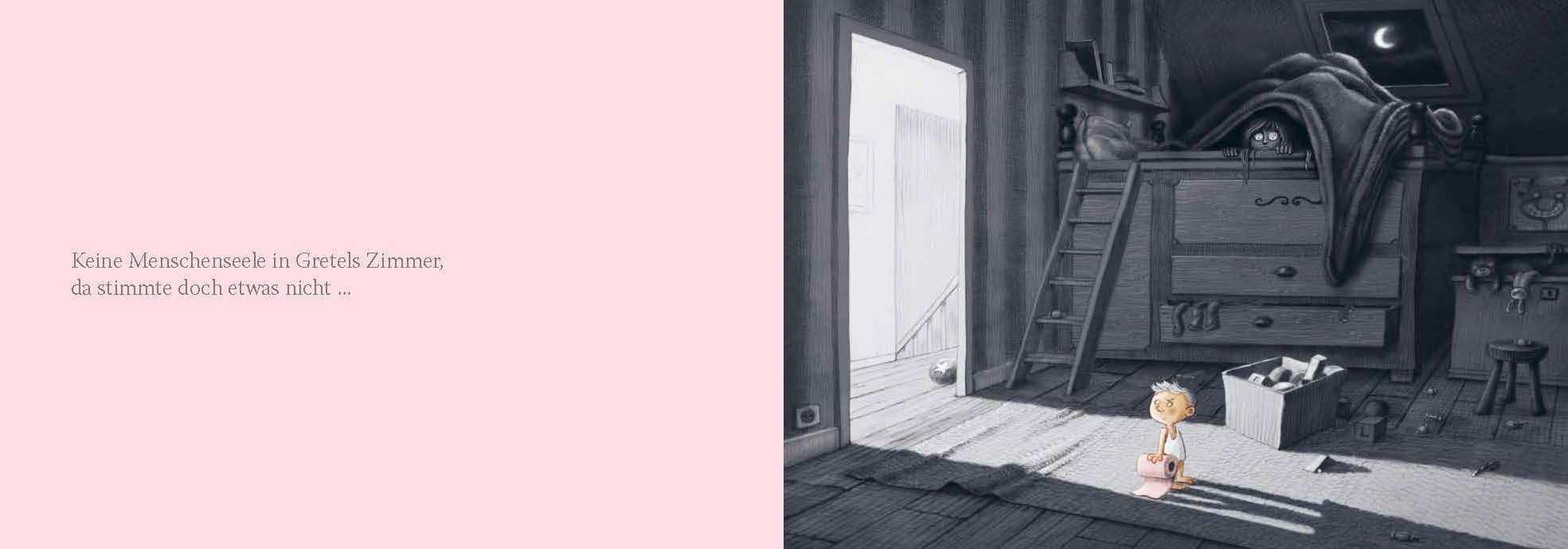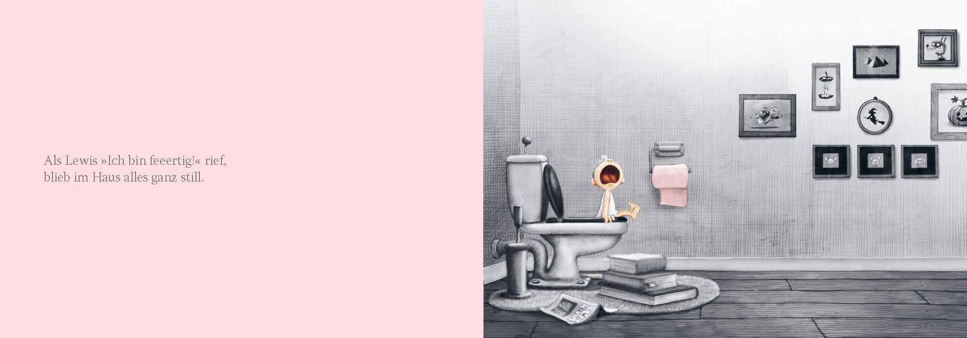 »Ich bin feeertig!«, ruft der kleine Lewis von seinem großen Thron, doch niemand kommt. Also macht er sich, bewaffnet mit einer flatternden Rolle rosa Klopapier, auf die Suche durch das ganze Haus und weiter. Vom Dachboden bis in den Keller, vom Garten bis in ...