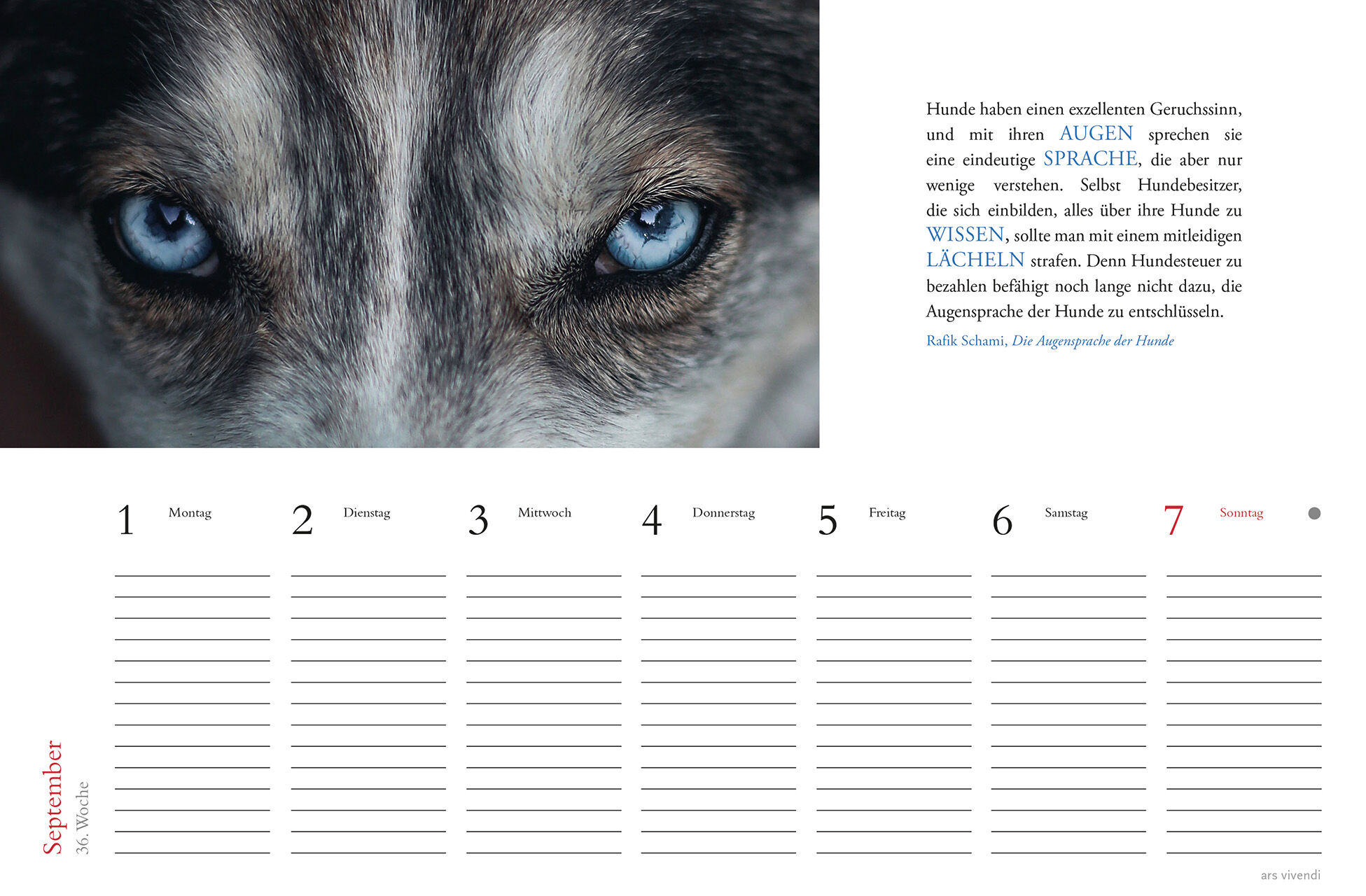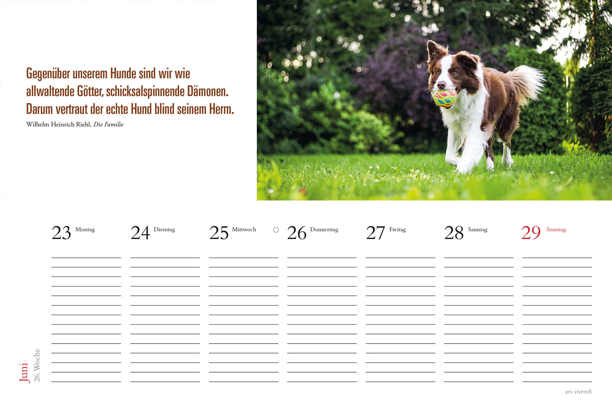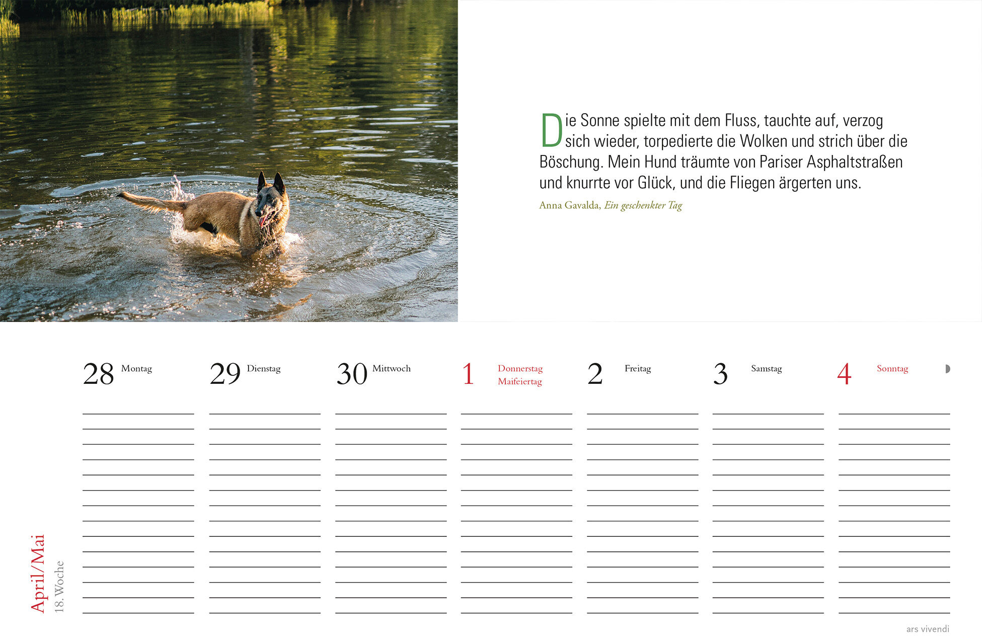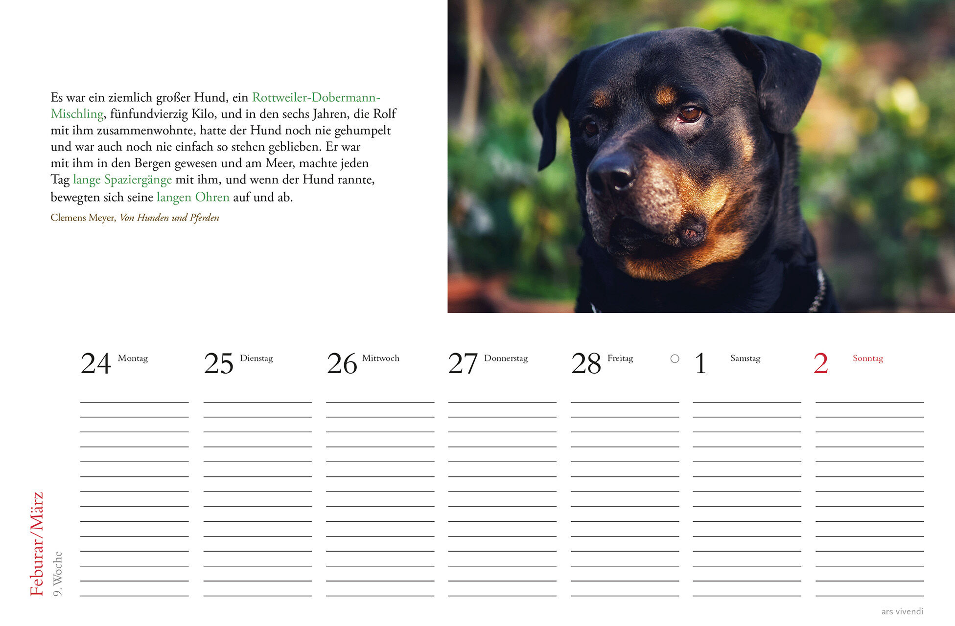 So lässt man sich gern an alle Termine der Woche erinnern! Mit wunderbaren Aufnahmen der Vierbeiner und literarischen Zitaten, die eines gemeinsam haben: Sie sind alle mit Wonne auf den Hund gekommen. Bewährte Kalender-Qualität von ars vivendi - Herstellung, ...