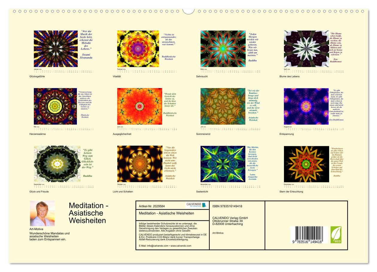 Wunderschöne Mandalas und asiatische Weisheiten laden zum Entspannen ein. Die meditativen Bilder und weisen Zitate sind Wellness für Körper und Seele. Dieser Kalender ist eine kleine Oase der Ruhe in unserer hektischen Welt.