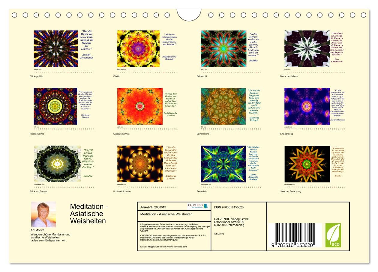 Wunderschöne Mandalas und asiatische Weisheiten laden zum Entspannen ein. Die meditativen Bilder und weisen Zitate sind Wellness für Körper und Seele. Dieser Kalender ist eine kleine Oase der Ruhe in unserer hektischen Welt.