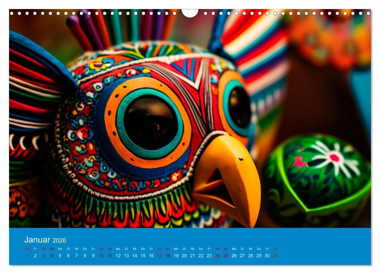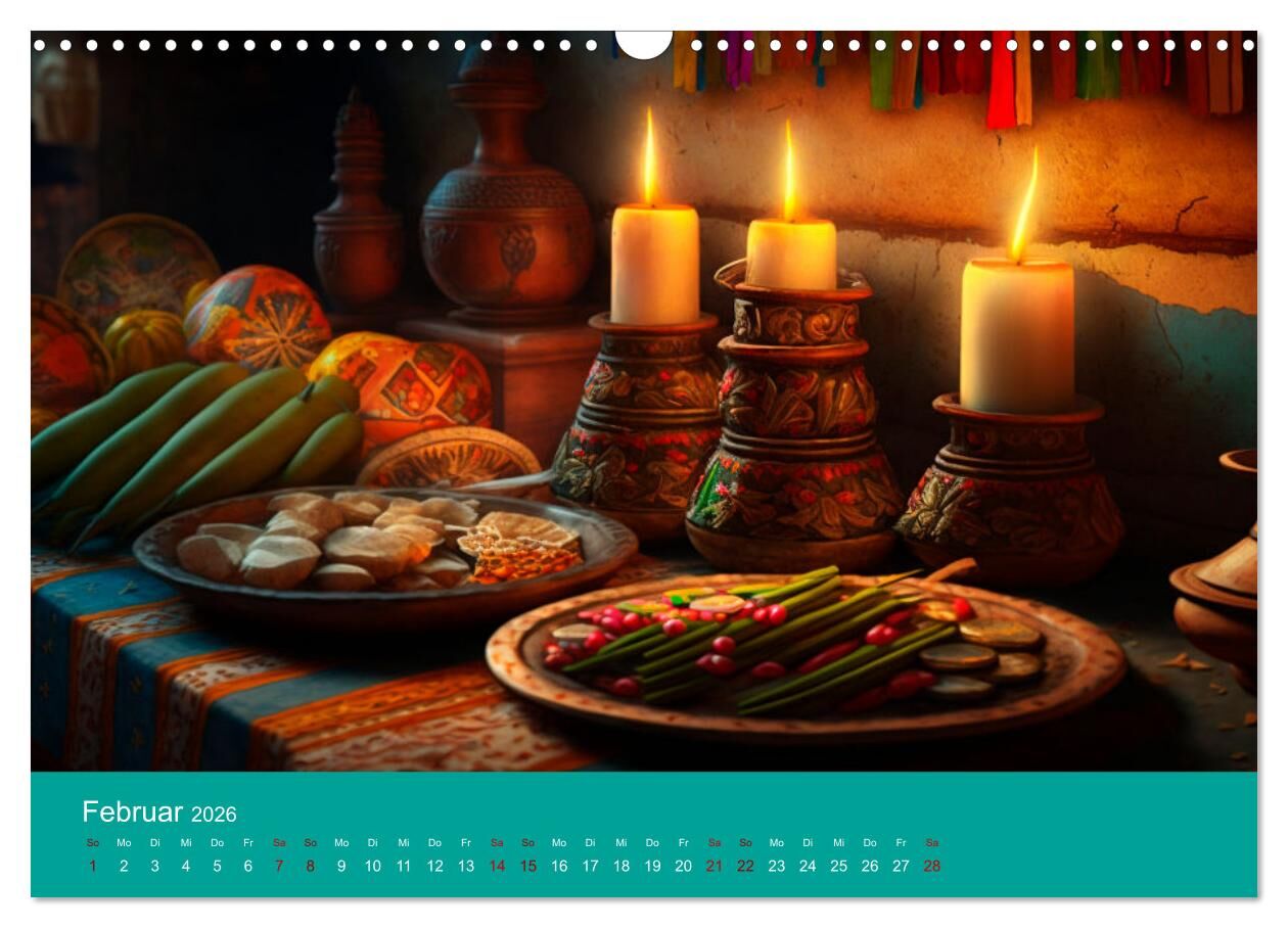 Unser Kalender 'Mexikanisches Jahr' nimmt Sie mit auf eine farbenfrohe Reise durch die Jahreszeiten Mexikos. Jeder Monat präsentiert Ihnen ein neues Motiv, das die Schönheit und Vielfalt des Landes zeigt - von blühenden Kakteen im Frühling bis hin zu bunten Dí...