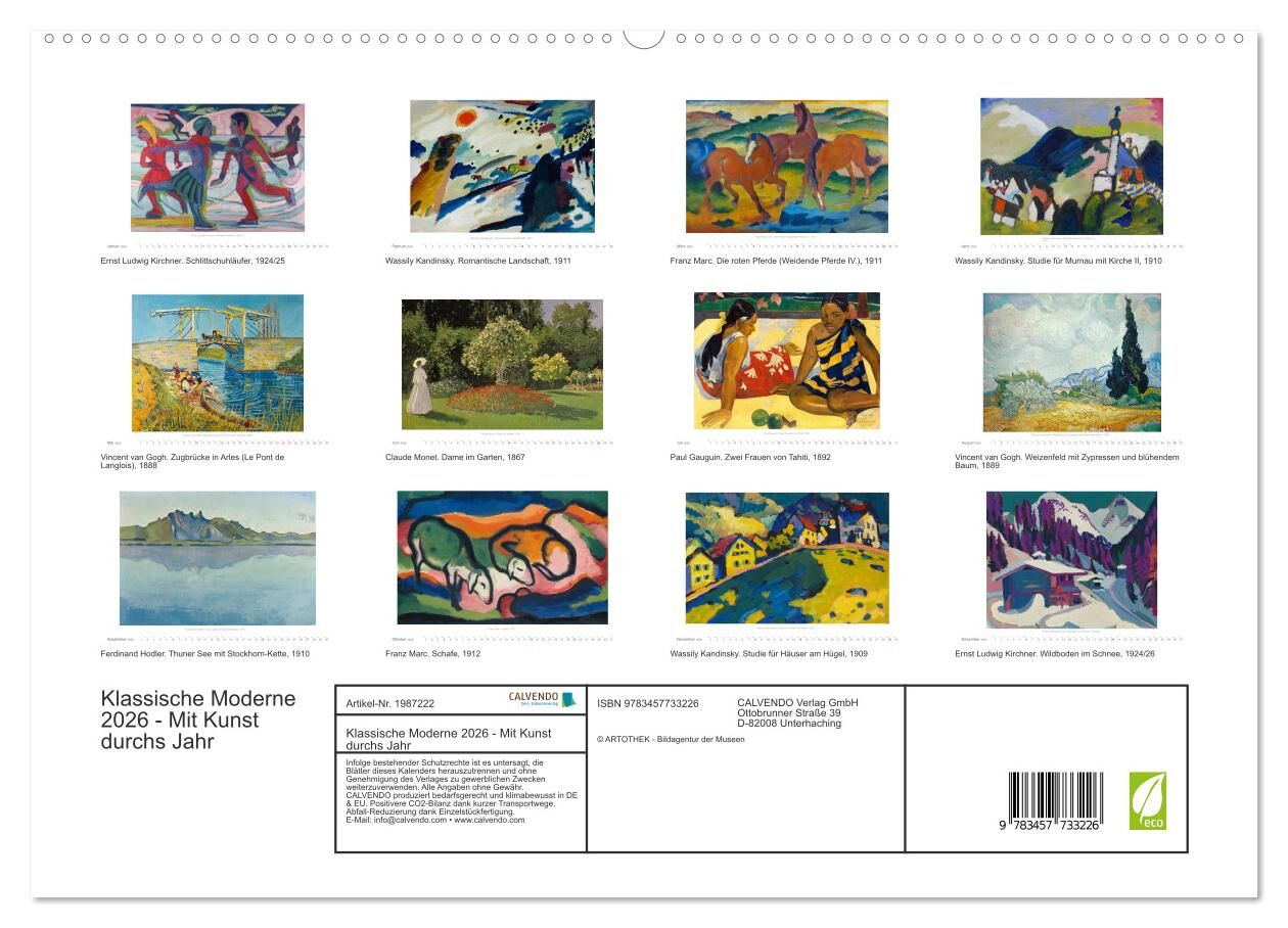 Zwölf farbenfrohe Gemälde von bekannten und beliebten Künstlern vom Impressionismus bis zur Klassischen Moderne in höchster Bildqualität. Vertreten sind u.a. Claude Monet, Vincent van Gogh, Wassily Kandinsky und Franz Marc. Ein abwechslungsreicher Kunstgenuss ...