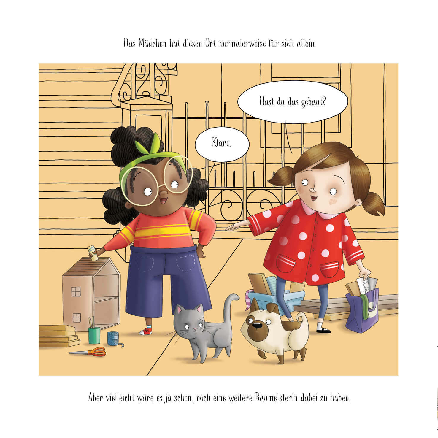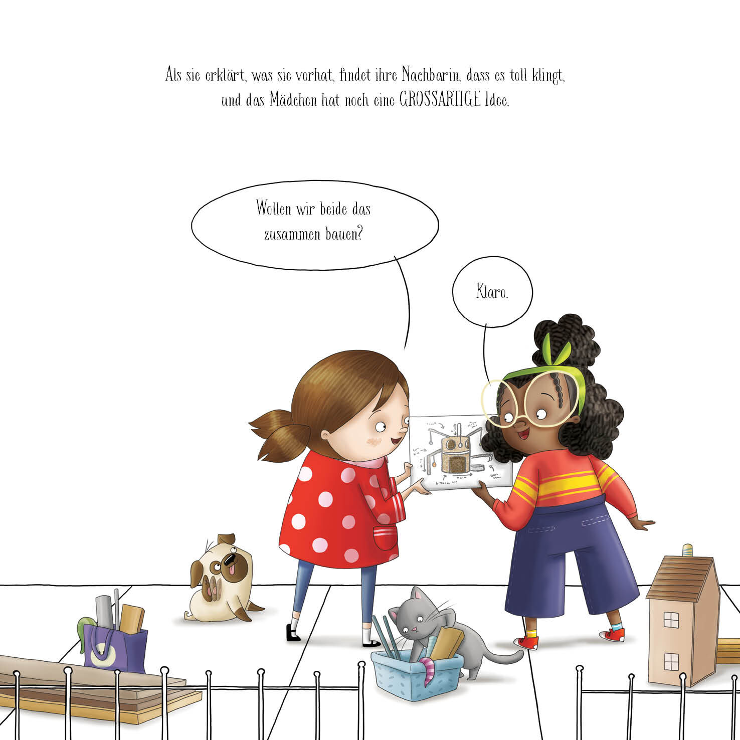 Das Madchen und ihr Hund wollen etwas bauen. Sie packen ihre Sachen zusammen und machen sich auf den Weg zu ihrem Lieblingsarbeitsplatz doch ihre Nachbarin mit ihrer Katze war zuerst da! Hmm, vielleicht konnten sie ja etwas gemeinsam machen? Eine großartige Id...