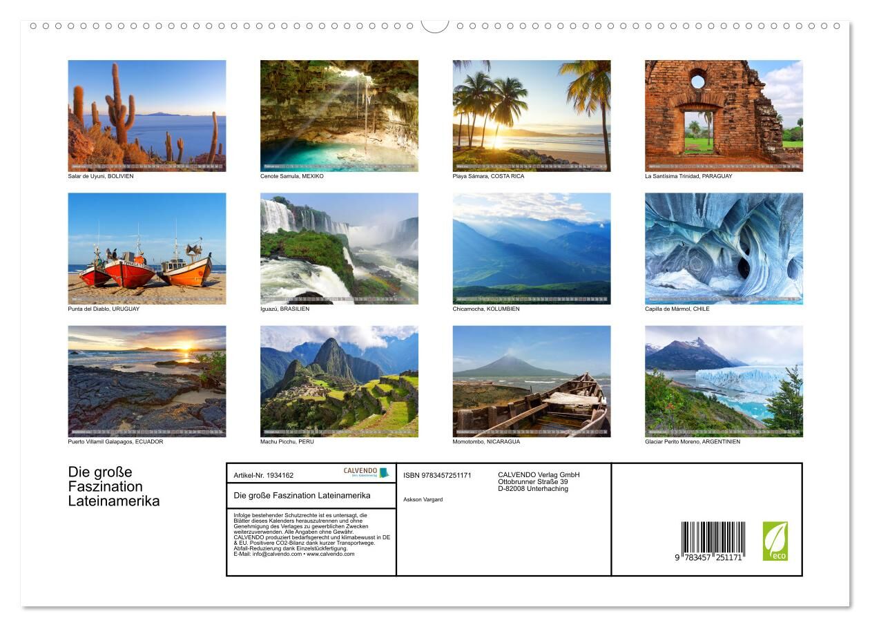 Dieser Kalender präsentiert authentische Fotografien aus Lateinamerika und entführt Sie Monat für Monat in ein anderes Land. Jedes Blatt zeigt beeindruckende Landschaften und Naturschönheiten von den Cenoten Mexikos im Norden bis zu den Gletschern von Argentin...